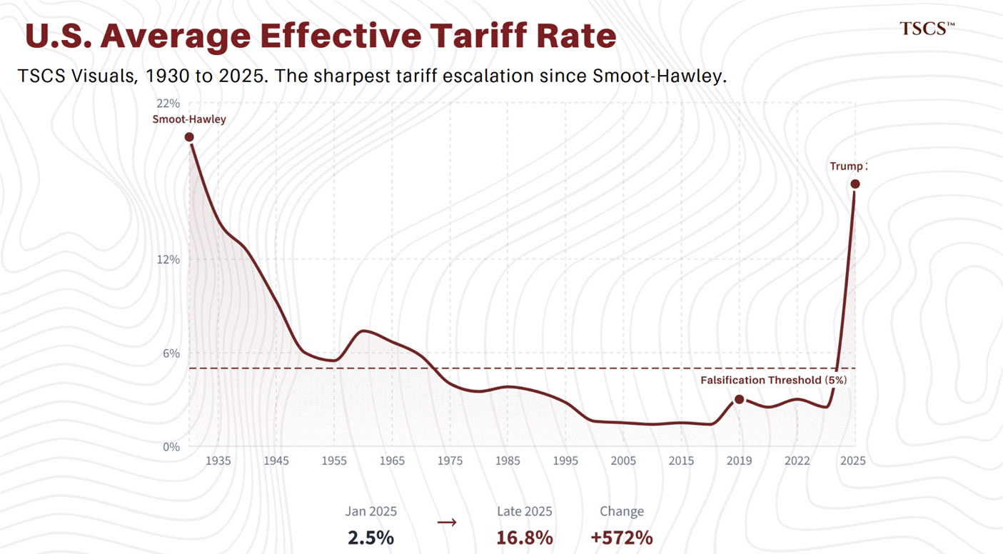 The Tariff Wall. Highest since 1946. The legal status unresolved. The market is not pricing persistence.