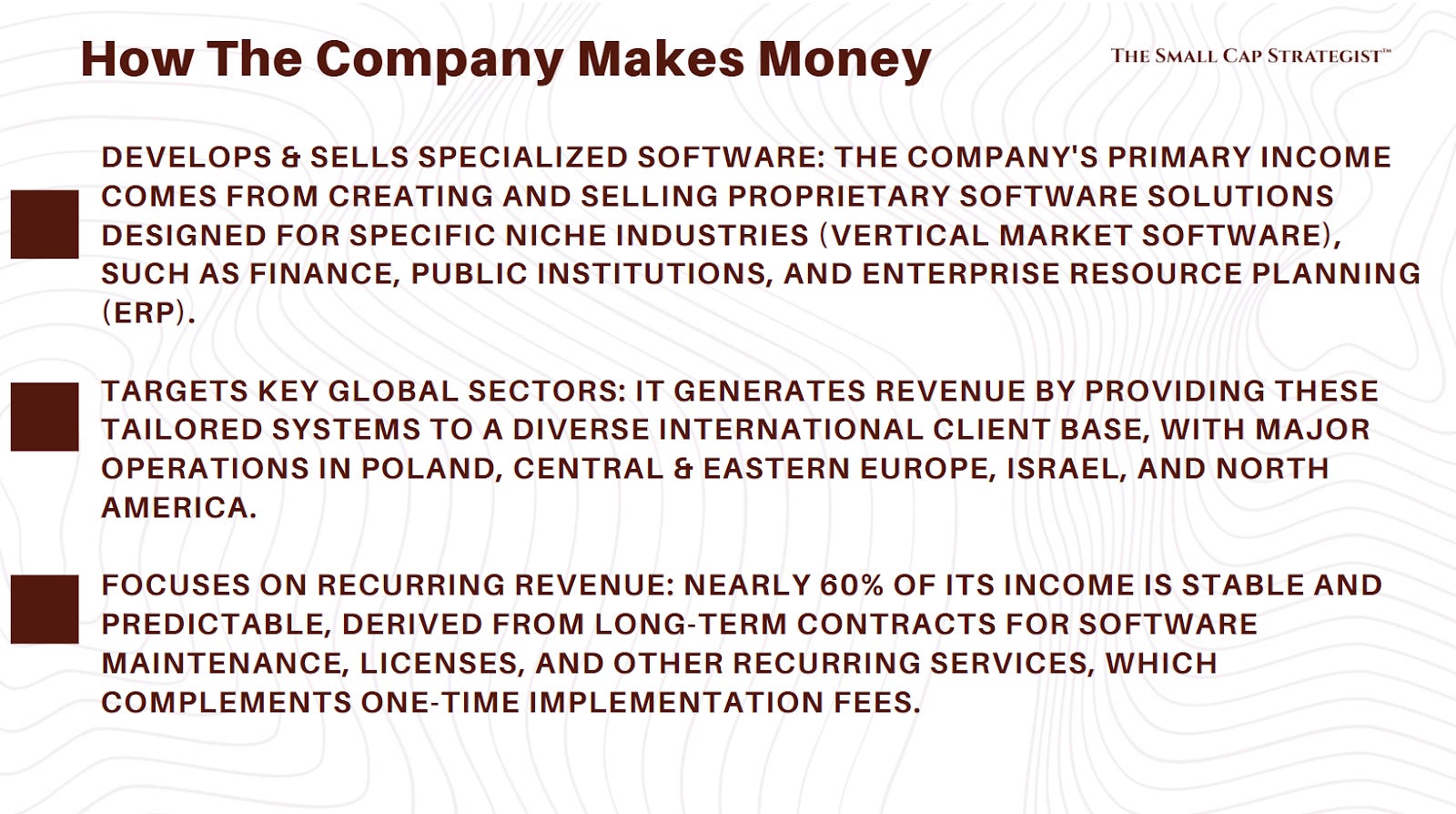 High Barriers to Entry: The VMS industry is protected by high barriers to entry, including the need for deep domain knowledge, complex regulatory requirements (especially in finance and public administration), and the challenge of displacing entrenched incumbents like Asseco.