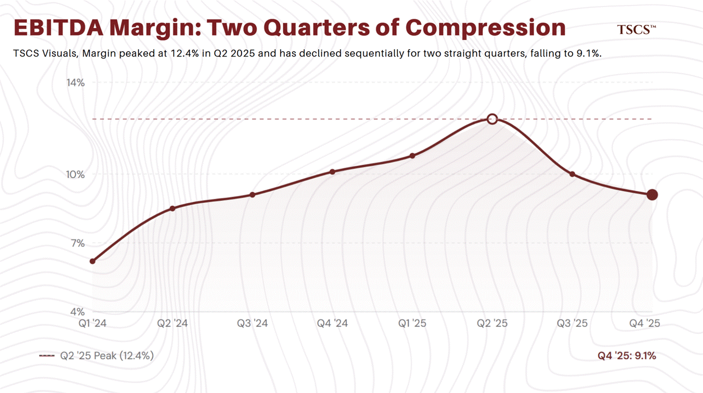 But the metrics that actually determine whether this business can service $4.8 billion in debt told a different story. Adjusted EBITDA of $511 million missed consensus of $536–$539 million by approximately $25-28 million, a 5-6% miss. More troublingly, EBITDA margin fell to 9.1%, down from 10.1% in Q4 2024 and 12.4% at its Q2 2025 peak. This marks two consecutive quarters of margin compression despite explosive revenue growth, the operational leverage that bulls relied upon is running in reverse.