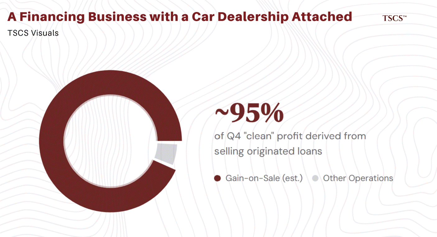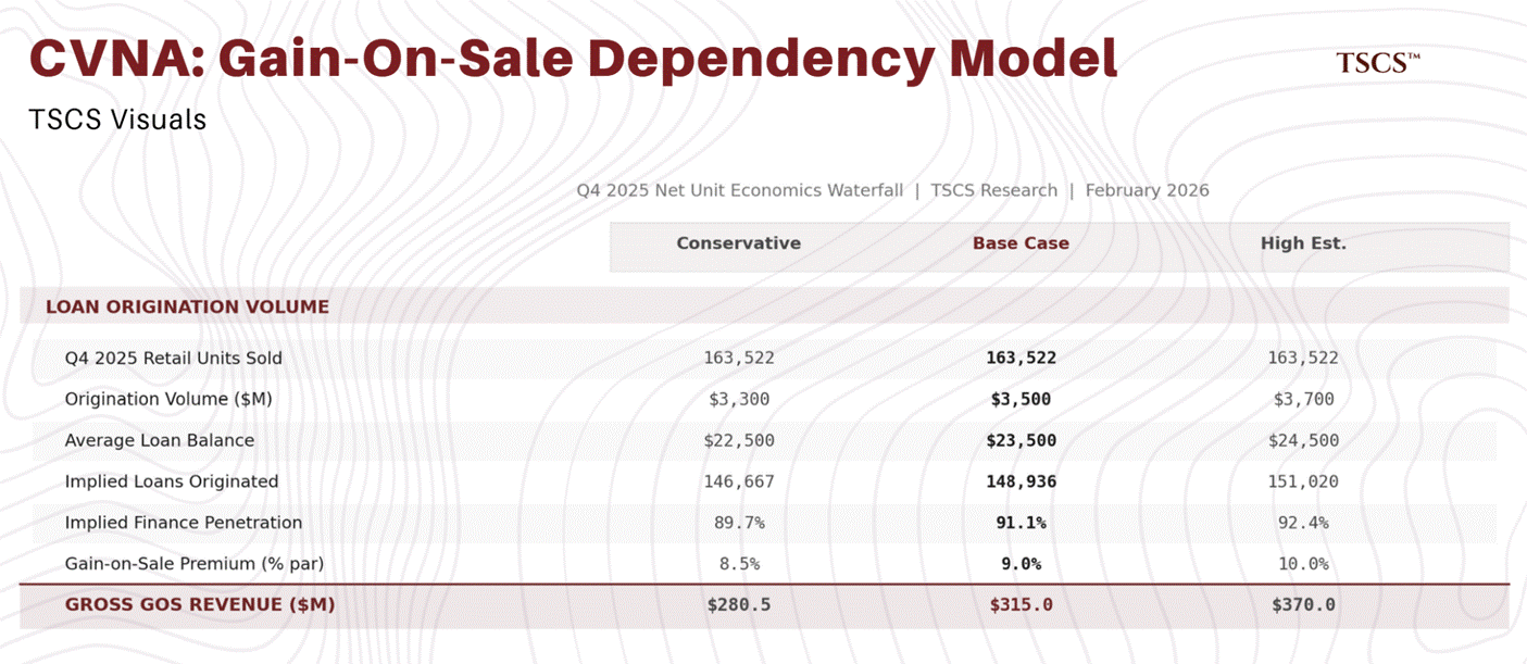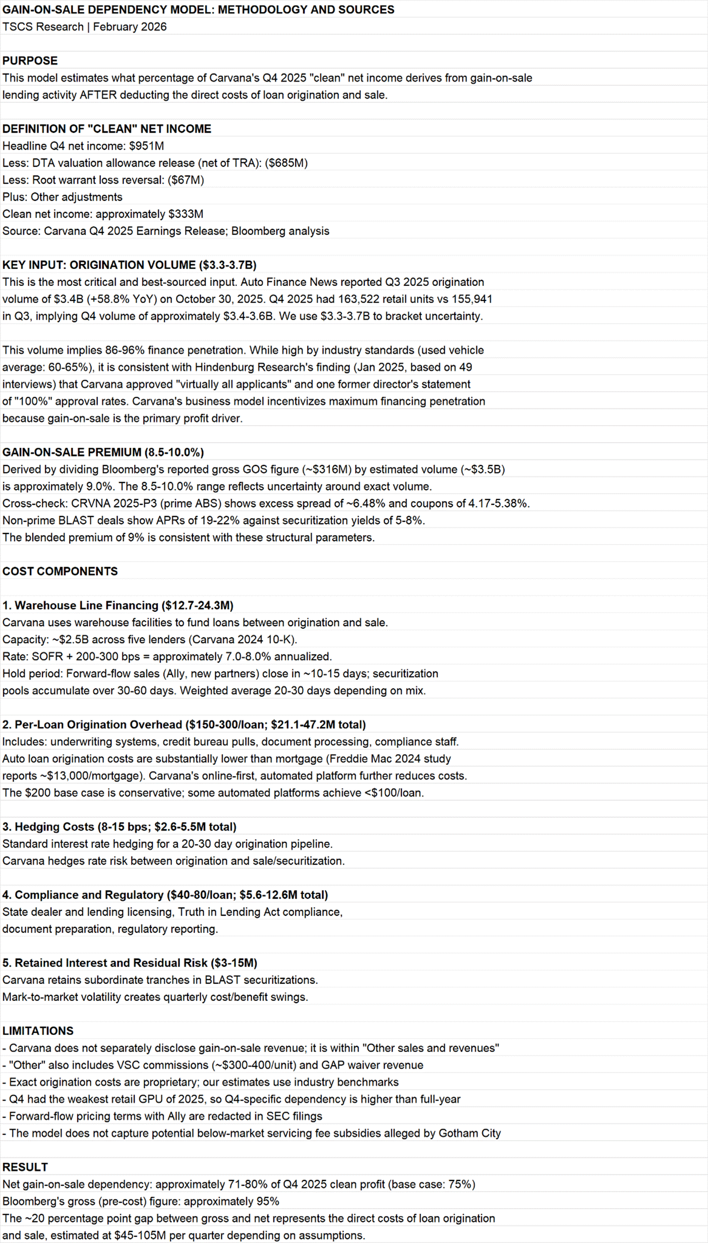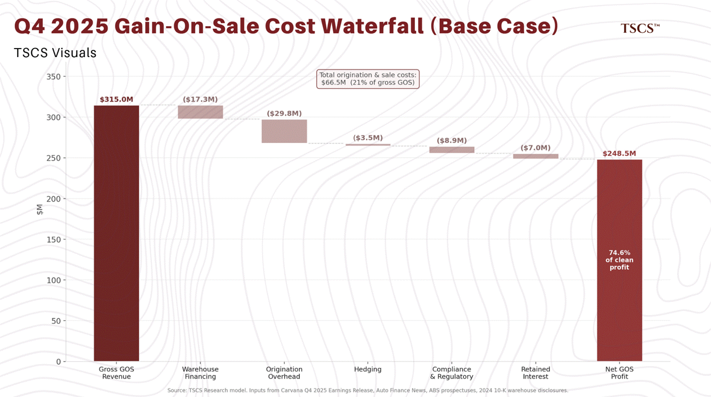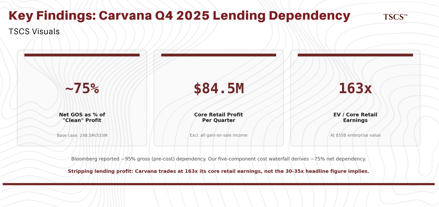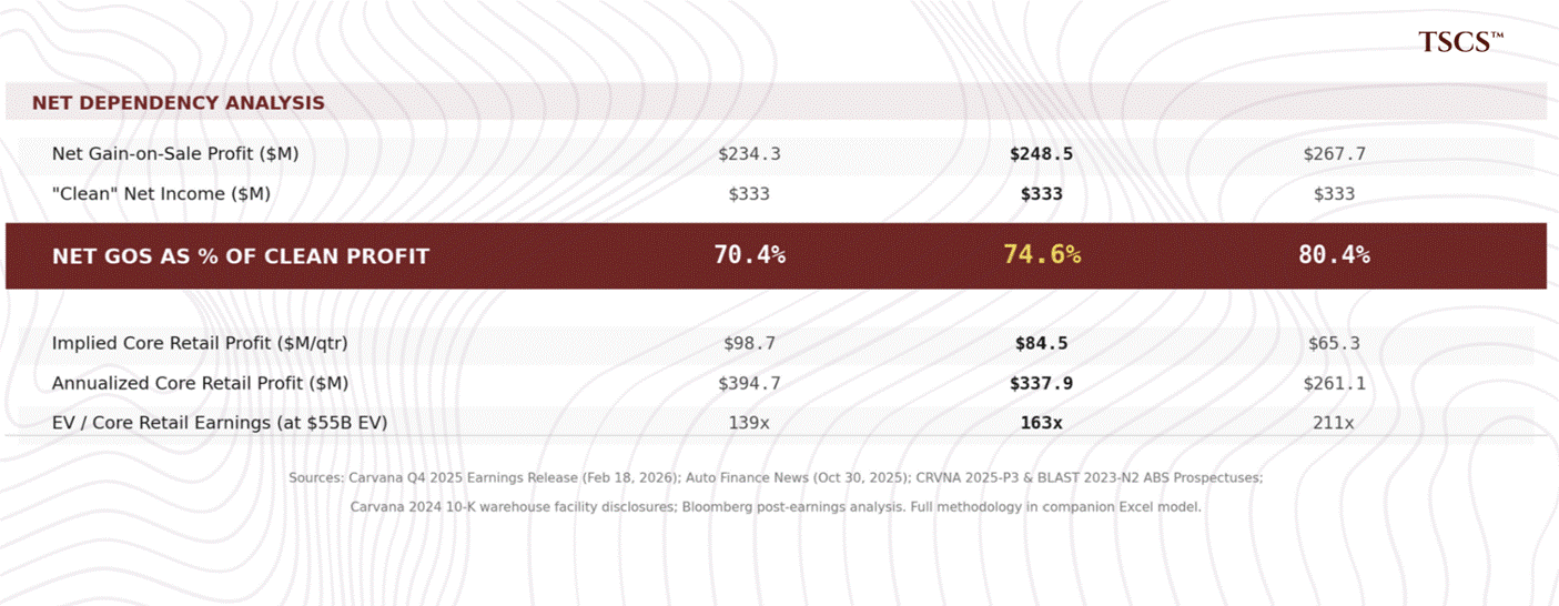 Bloomberg reported that 95% of Q4 clean profit came from gain-on-sale. Our proprietary model, which accounts for direct origination costs that Bloomberg’s gross figure does not deduct, estimates the true net dependency at 70 to 80%, with a base case of 75%. The full methodology, sourced assumptions, and sensitivity tables are included below. Either way, the conclusion is the same: this is a financing business with a car dealership attached, not the other way around.