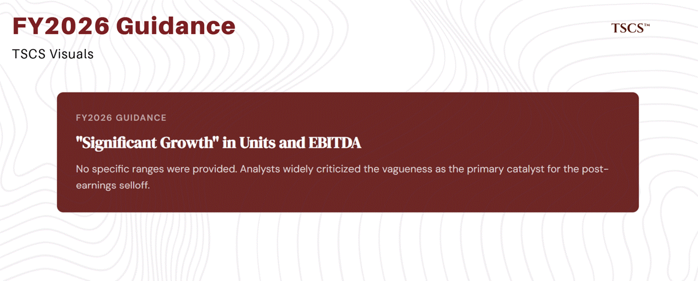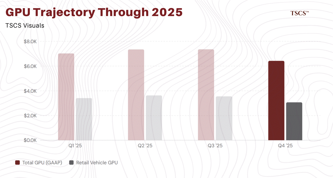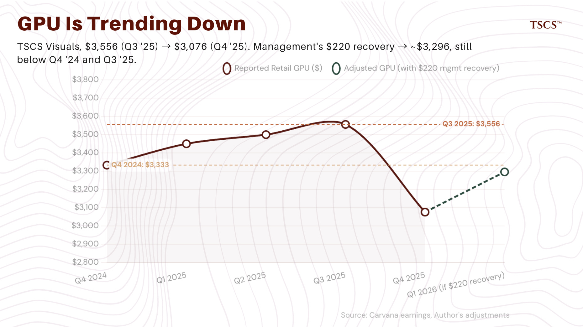 Retail GPU of $3,076 was the lowest of all four quarters in 2025. Management attributed the decline to three factors: lower shipping fees passed to customers, higher reconditioning costs (particularly at newly integrated ADESA locations with the youngest management teams), and higher industry-wide depreciation rates. CEO Garcia III acknowledged reconditioning issues would persist into Q1 2026, estimating that if all locations matched top-quartile per-unit costs, reconditioning would be ~$220 lower per unit. The guidance for FY2026 was conspicuously vague, just “significant growth” in units and EBITDA, with no specific ranges, which analysts widely criticized as the primary catalyst for the selloff.