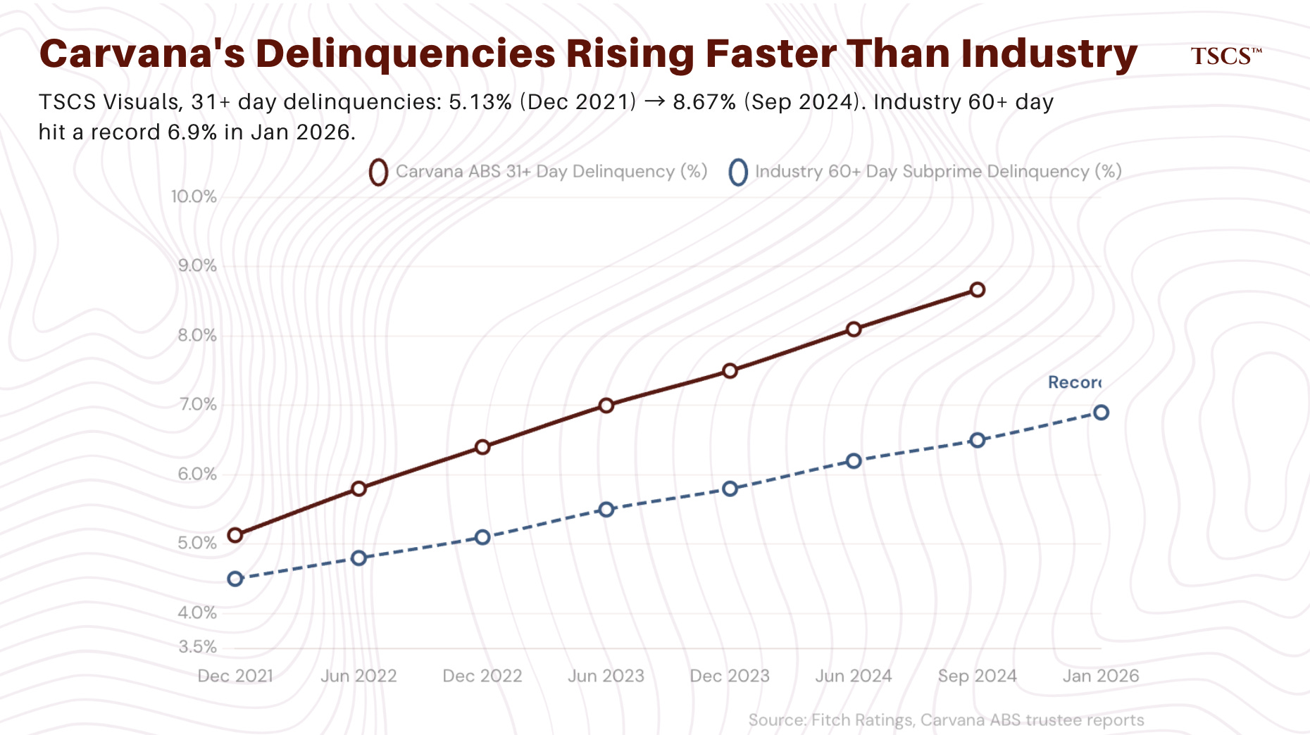 The timing is ominous. Fitch Ratings reported that 60+ day subprime auto loan delinquencies hit a record 6.9% in January 2026, the highest since tracking began in the early 1990s. Across Carvana’s own ABS pools, 31-day-plus delinquencies (a broader measure than Fitch’s 60-day standard) increased from 5.13% (December 2021) to 8.67% (September 2024). While this is not a direct apples-to-apples comparison with the industry’s 60-day metric, the trajectory is unambiguous: Carvana’s delinquencies are rising faster than the broader market, even on the less stringent 31-day threshold, at a time when the company claims credit quality is improving.