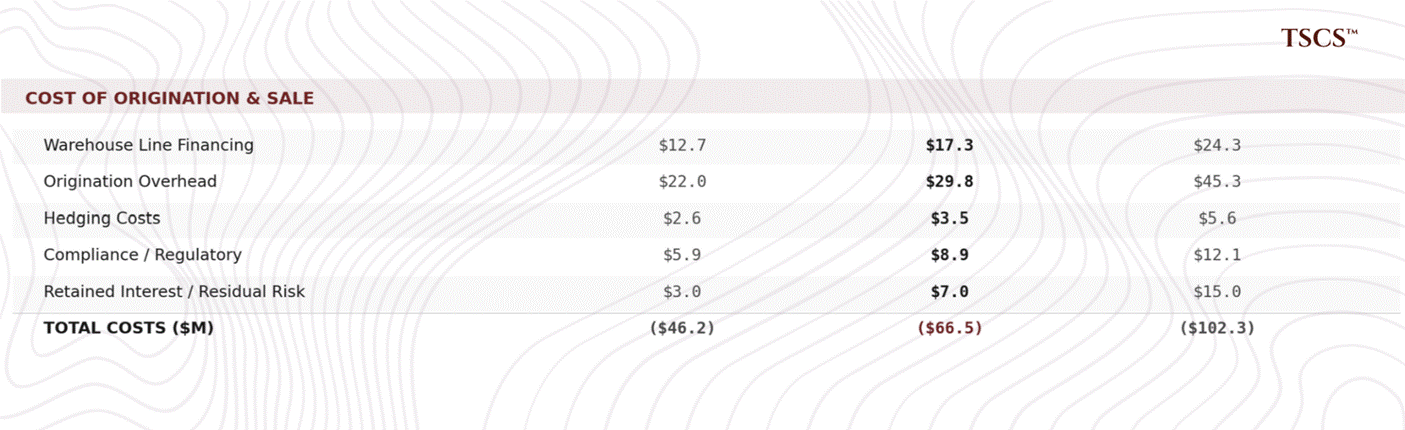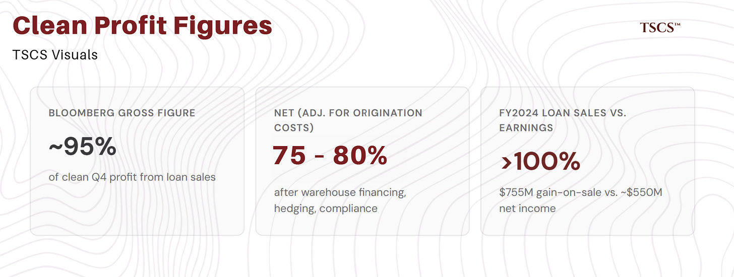 Deducting estimated direct costs of origination and sale, including warehouse line financing ($13 to $24 million at SOFR plus 200 to 300 basis points on a 20 to 30 day weighted average hold period), per-loan origination overhead ($150 to $300 per loan across approximately 147,000 to 151,000 originated loans), interest rate hedging ($3 to $6 million), compliance and regulatory costs ($6 to $13 million), and retained interest mark-to-market ($3 to $15 million), total origination costs were approximately $46 to $102 million. The resulting net gain-on-sale contribution was $234 to $268 million, representing approximately 70 to 80% of Q4 clean profit, with a base case of 75%. The full model, with sourced assumptions and sensitivity tables, is available as a companion to this analysis.