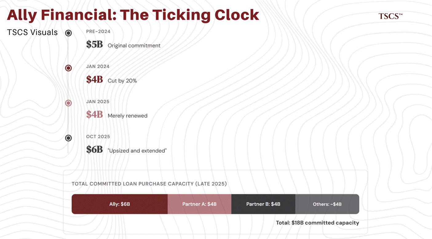 In January 2024, Ally reduced its forward-flow commitment from $5 billion to $4 billion, a move that predated Hindenburg’s report by a full year. Following the Hindenburg publication in January 2025, Ally merely renewed at the existing $4 billion level, via an 8-K filing on January 3, 2025. Carvana subsequently announced on its Q3 2025 earnings call (October 29, 2025) that the Ally agreement had been “upsized and extended” to $6 billion through October 2027. On the Q4 2025 earnings call (February 18, 2026), CEO Garcia referenced the Ally commitment as “$6 billion with Ally through October 2026,” a shorter term than the Q3 disclosure, though it is unclear whether this reflects an amendment or a misstatement, alongside two new $4 billion partnerships with unnamed loan sale partners, bringing total committed capacity to $18 billion.