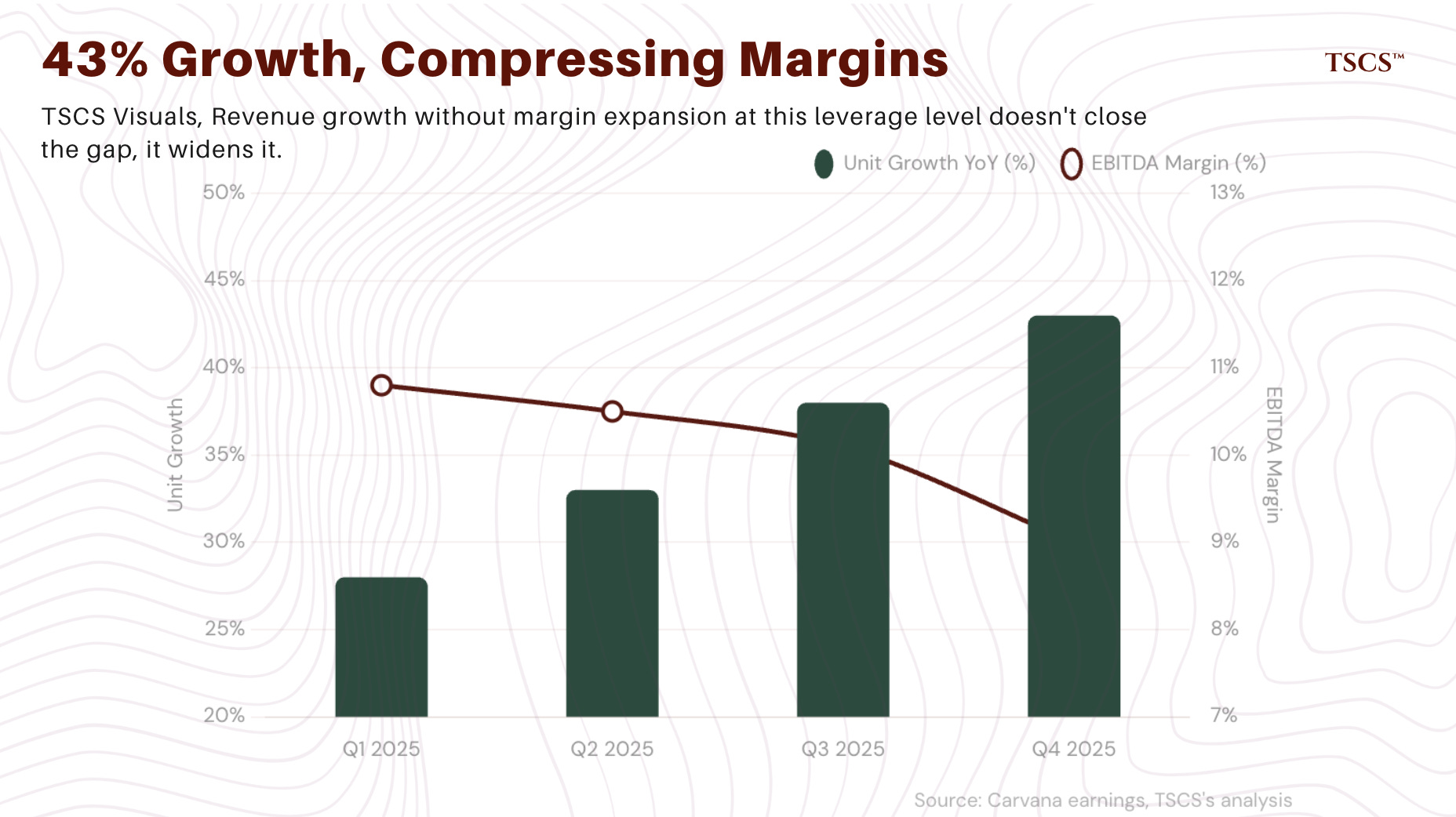 But here is the critical distinction the bulls elide: operational scaling and market share gains are necessary conditions for the Carvana thesis, not sufficient ones. The company had 43% unit growth and 58% revenue growth in Q4, and EBITDA margins still compressed. GPU still fell. Operating margin was essentially flat year-over-year despite massive top-line growth.