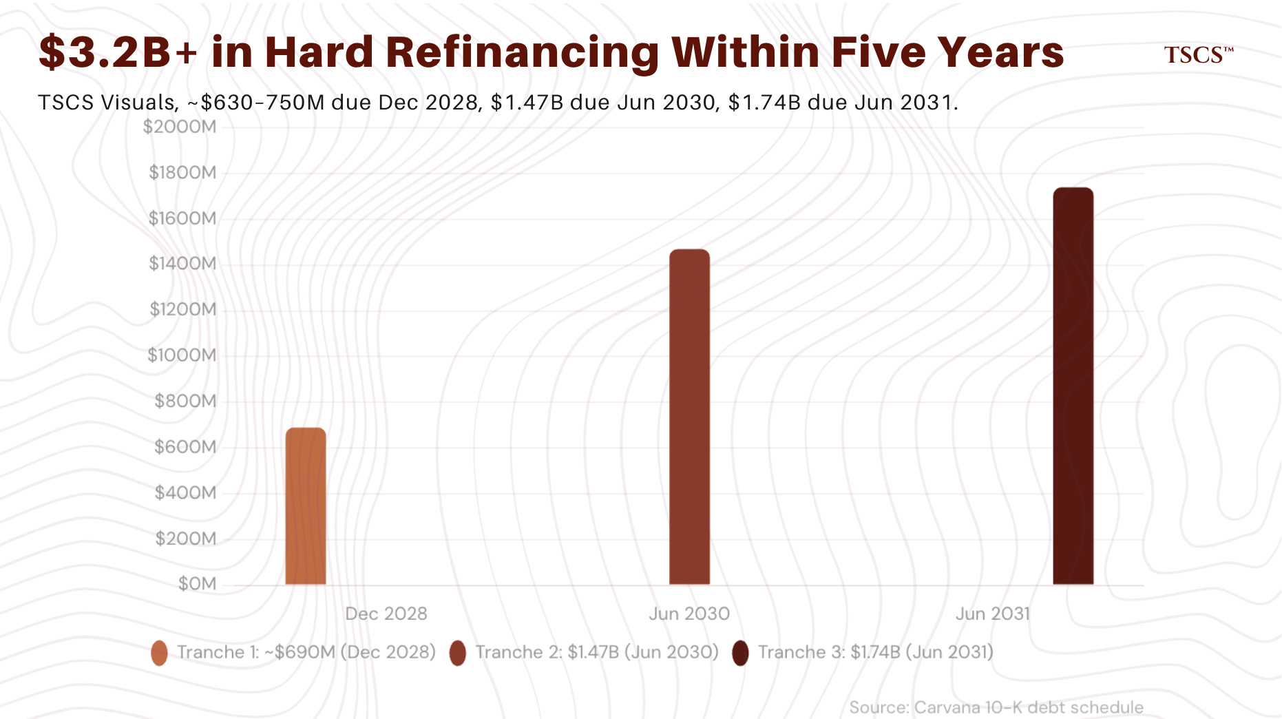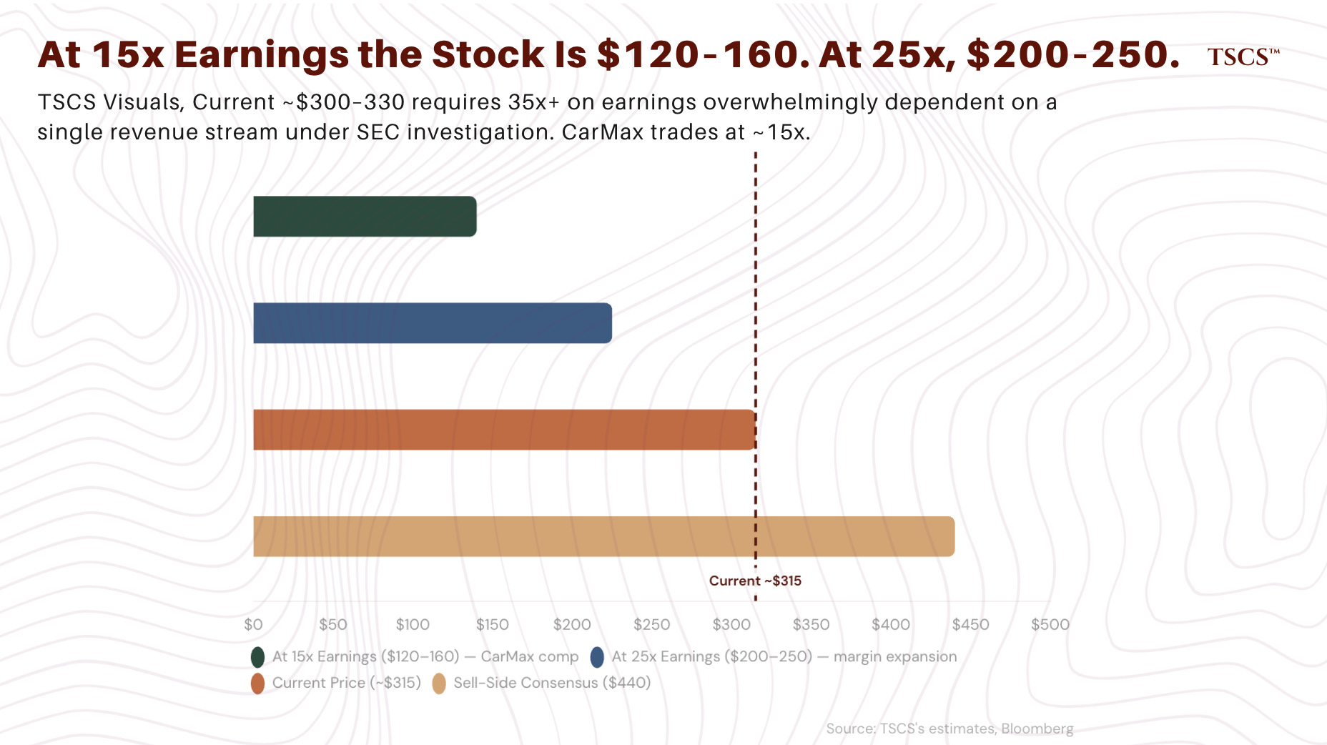 To frame the valuation question concretely: strip out gain-on-sale income and Carvana generated approximately $16 million in Q4 operating profit from its core retail operations. Annualized, that implies the vehicle retail business alone, excluding the financing engine, is earning roughly $64 million pre-tax on a $55+ billion enterprise value, or approximately 860x. Even if you credit the full gain-on-sale stream at face value but apply a 15x earnings multiple (generous for a capital-intensive retailer with 9% EBITDA margins and $4.8 billion in debt), the stock would be valued in the $120 to $160 range. At 25x, which assumes sustained margin expansion and uninterrupted financing income, the range extends to $200 to $250. For comparison, CarMax, the largest traditional used car retailer, trades at roughly 15x P/E. The current price of approximately $300 to $330 requires a 35x+ multiple on earnings that are overwhelmingly dependent on a single revenue stream under active SEC investigation.