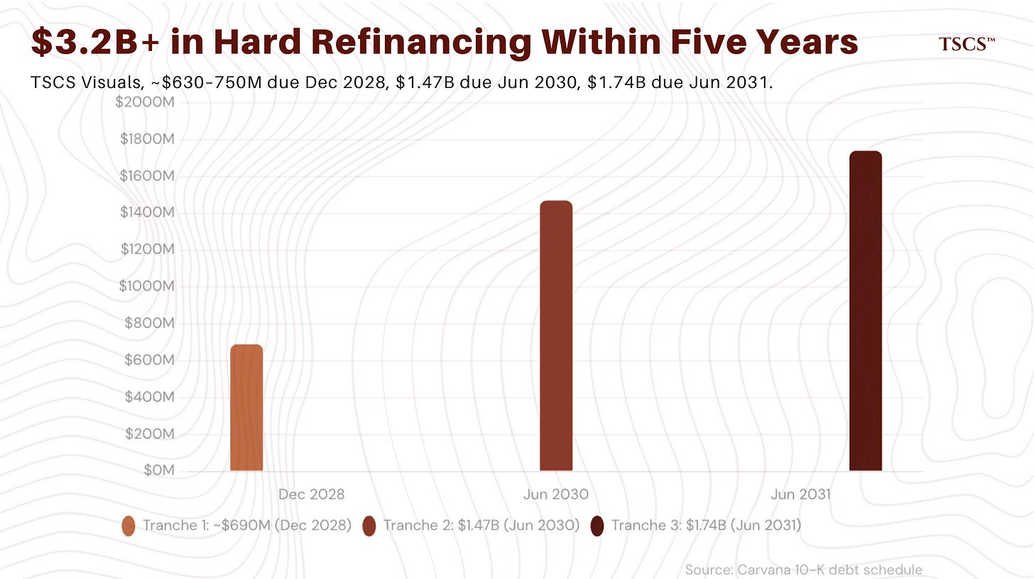 Critically, the TRA liability is not merely an accounting offset. It represents a contractual obligation to pay 85% of realized tax savings to Garcia family-controlled LLC unit holders over the next 15 to 20 years. As Carvana utilizes its deferred tax assets against future taxable income, it will owe cash payments to the Garcia entities, estimated at $100 to $200 million annually at current profitability levels. This creates a structural cash transfer from the public company to the controlling family that persists regardless of whether the underlying tax benefit was legitimately recognized.