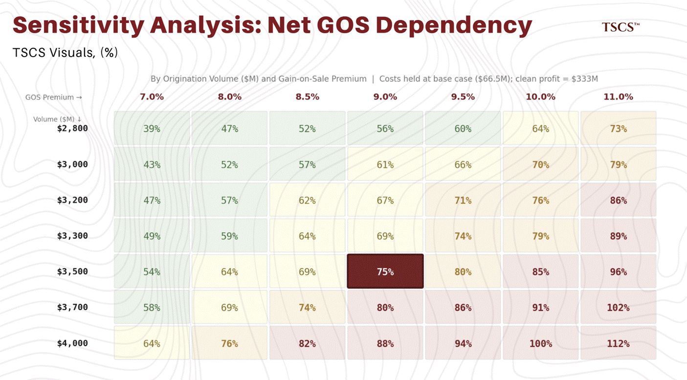 We built our own bottom-up Gain-on-Sale Dependency Model for this report, using publicly verifiable inputs (origination volumes, warehouse line costs, hedging estimates, compliance overhead, and retained interest assumptions) to calculate the net contribution of loan sales to quarterly earnings.