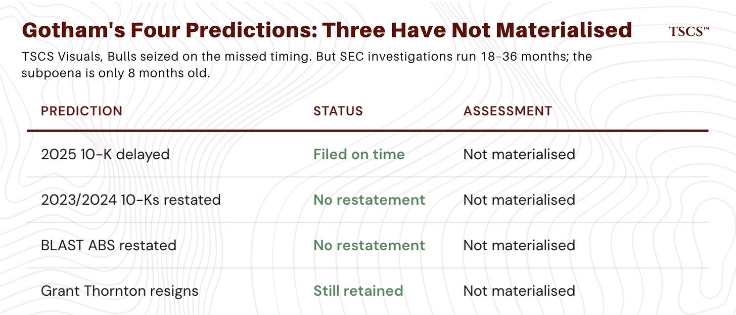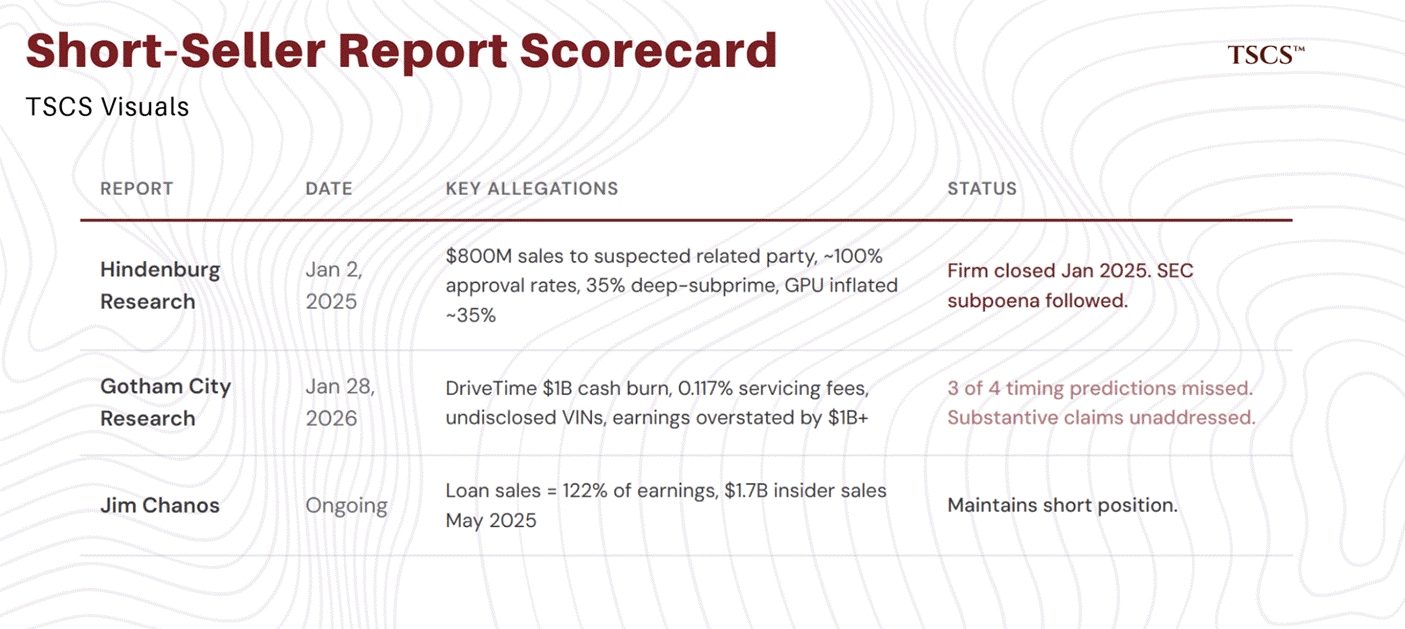 Gotham made four specific timing predictions: (1) Carvana’s 2025 10-K would be delayed, (2) 2023/2024 10-Ks would be restated, (3) BLAST ABS would be restated, and (4) Grant Thornton would resign. As of February 18, three of these four predictions have failed to materialize: the 10-K was filed on schedule, Grant Thornton has not resigned, and no restatements have been announced. Bulls, including JPMorgan’s Rajat Gupta, seized on these missed predictions to argue that the short thesis is discredited. BTIG called the report’s most serious allegations “not well-founded.” Needham’s Chris Pierce stated he did not believe Carvana needed “sweetheart deals” to sell subprime loans.