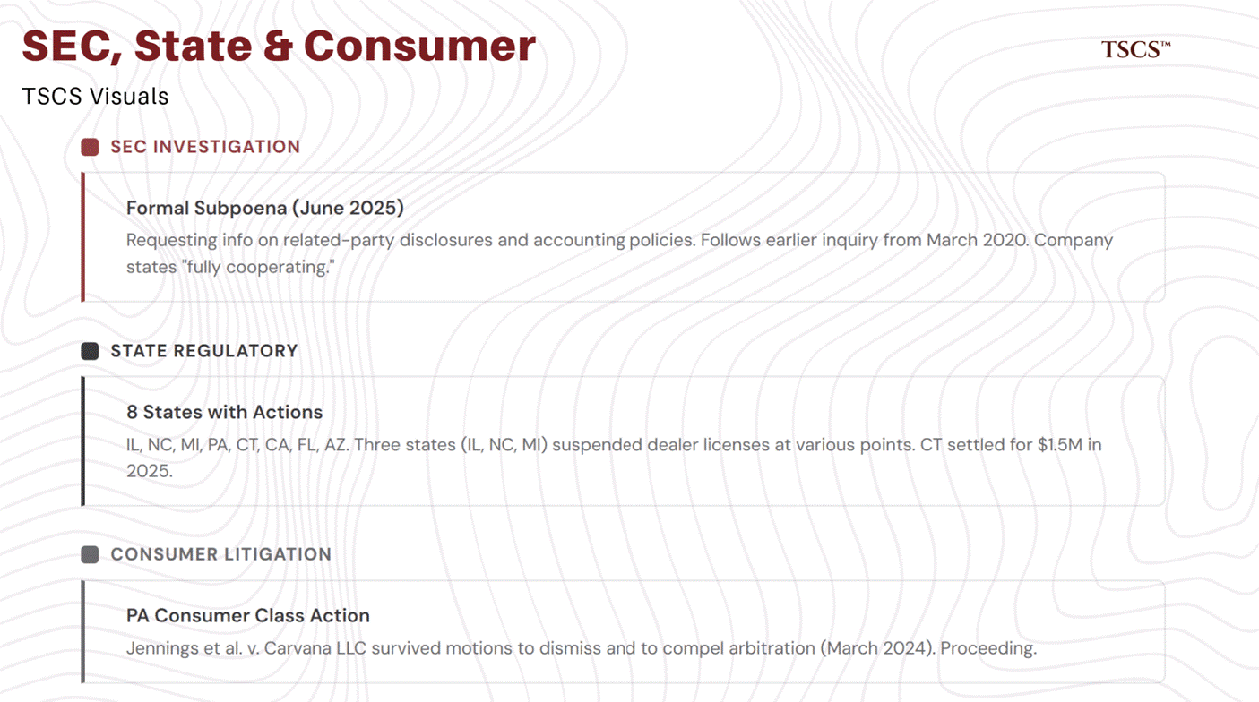 On the consumer front, the Pennsylvania consumer class action (Jennings et al. v. Carvana LLC) survived motions to dismiss and to compel arbitration in March 2024 and is proceeding. At least eight states (Illinois, North Carolina, Michigan, Pennsylvania, Connecticut, California, Florida, Arizona) have taken regulatory action against Carvana, with Illinois, North Carolina, and Michigan having actually suspended Carvana’s dealer license at various points. Connecticut settled for $1.5 million in 2025. All three Delaware shareholder lawsuits (direct offering, insider trading, supervoting challenge) have been resolved in Carvana’s favor, but the factual record they established feeds directly into the ongoing federal case and SEC investigation.