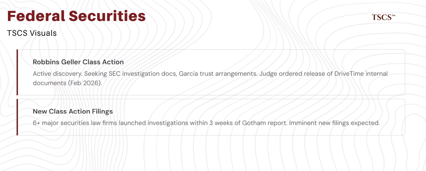 The Robbins Geller securities class action (United Association National Pension Fund v. Carvana, No. 2:22-cv-02126, D. Ariz.) is now in active discovery after surviving multiple motions to dismiss. In recent hearings, plaintiffs are seeking documents related to two SEC investigations (2019 and 2025), the Garcia father-son trust arrangements, and accusing Carvana of intentionally misusing online discovery tools to delay document production. Carvana has refused to release DriveTime financial details in this lawsuit. A federal judge reportedly ordered the release of previously withheld DriveTime internal documents in mid-February 2026.