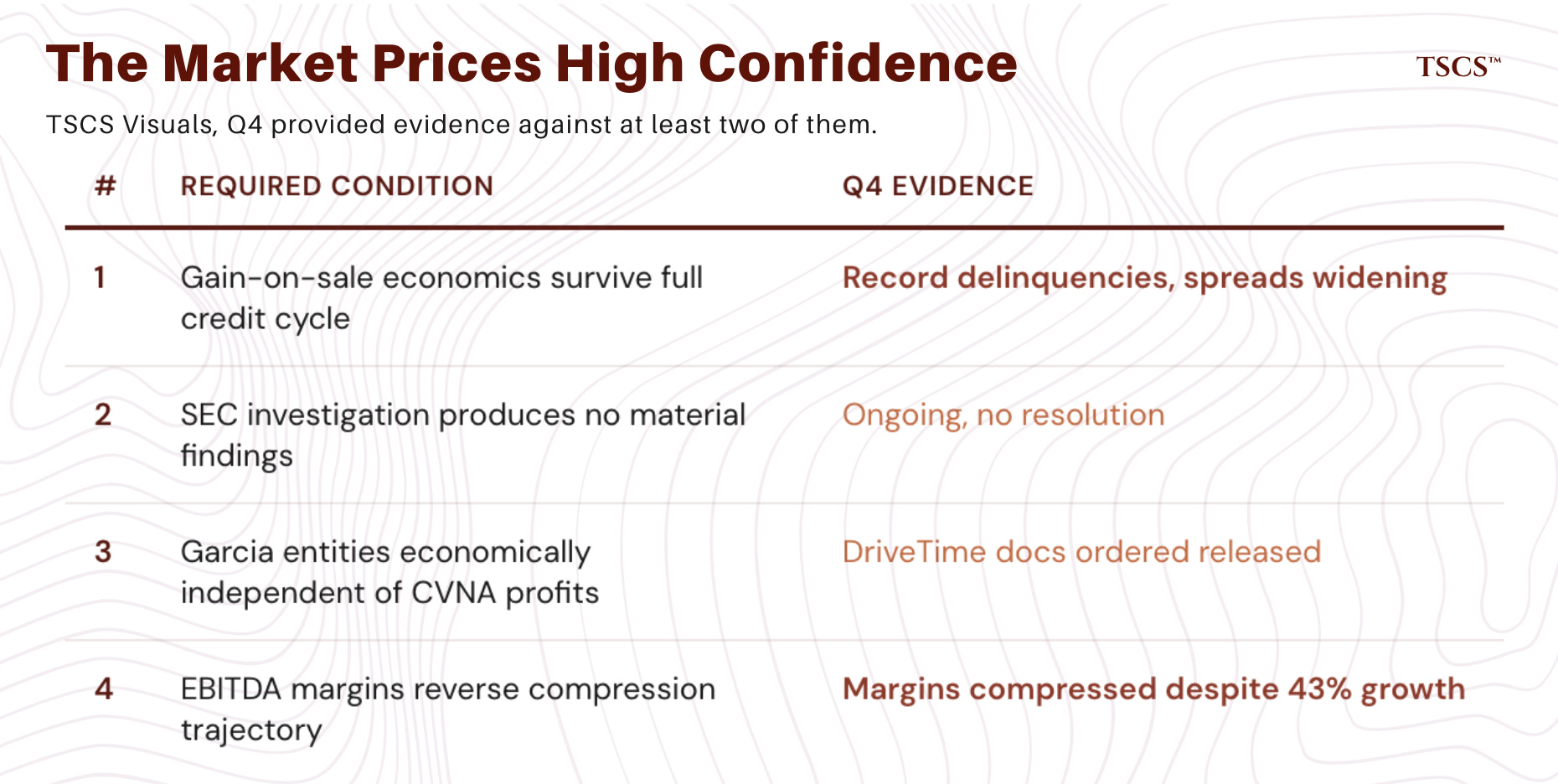 To be explicit about the bull scenario: if Carvana achieves 1.5 million units at 13.5% EBITDA margins (management’s implied long-term target), that produces roughly $4.1 billion in EBITDA. At 15x EV/EBITDA, a premium but not unreasonable multiple for a scaled platform with competitive moats, the equity would be worth $550 to $650 per share after netting debt. At 20x, it approaches $800. The bull case is not irrational; it is genuinely possible. But it requires that gain-on-sale economics remain intact through a full credit cycle, that the SEC investigation produces no material findings, that the Garcia family’s private entities are economically independent of Carvana’s reported profits, and that EBITDA margins reverse their current compression trajectory. The market is pricing in high confidence across all four conditions simultaneously. Q4 provided evidence against at least two of them.