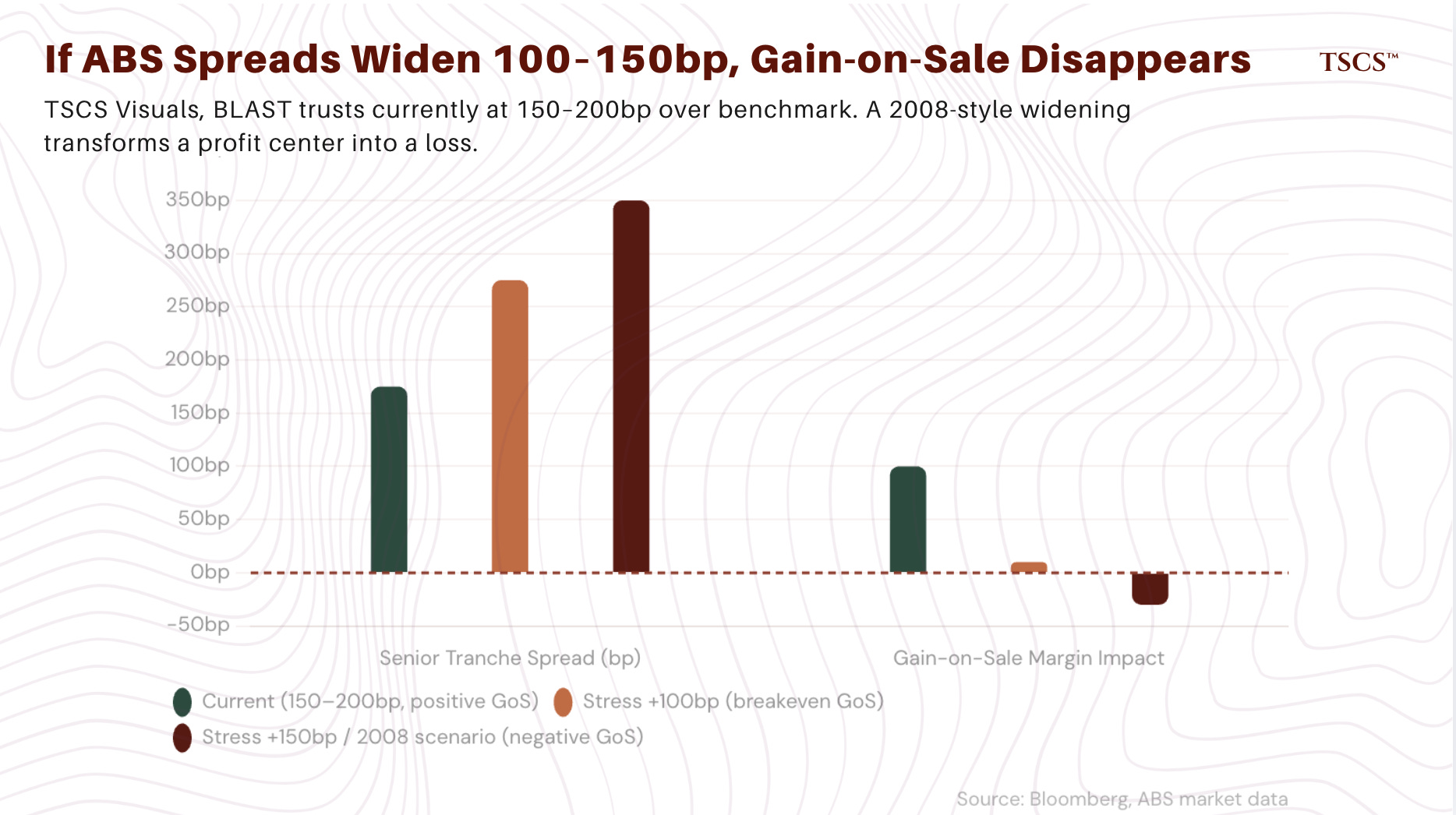 The transmission mechanism is ABS spread widening. Carvana’s BLAST securitization trusts currently price at roughly 150 to 200 basis points over benchmark for senior tranches, but subordinate tranches have seen spread compression reverse in late 2025. If subprime auto ABS spreads widen by 100 to 150 basis points, as occurred in 2008 and briefly in early 2020, the gain-on-sale premium that Carvana books at origination compresses or disappears entirely. The company would still be selling loans, but at par or below, transforming a profit center into a break-even or loss-making activity. This is not a tail risk; it is the base case if delinquency trends continue on their current trajectory.
