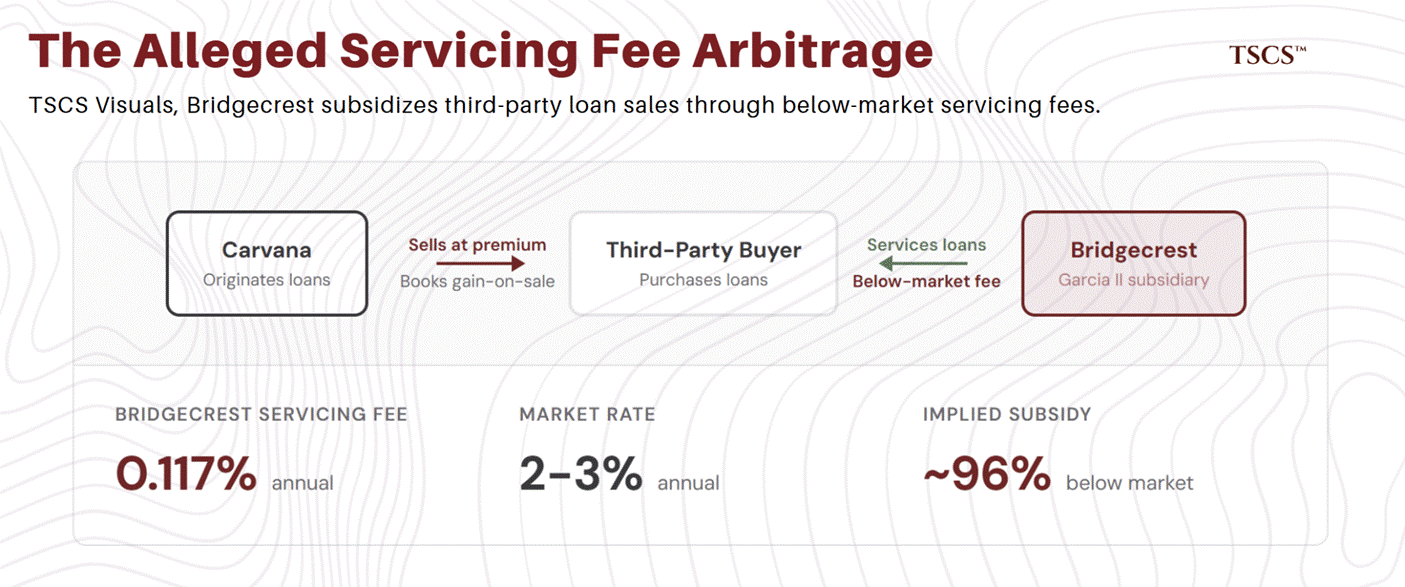 Gotham identified a servicing fee arbitrage mechanism: Bridgecrest (Garcia II’s loan servicing subsidiary) charges “third-party” loan buyers an estimated 0.117% annual servicing fee, versus a market rate of 2–3%. The theory: Carvana sells loans to third parties at inflated prices (booking gain-on-sale), while Bridgecrest subsidizes the arrangement through below-market servicing fees. Gotham also found dozens of VINs tied to Carvana-sold vehicles appearing on Bridgecrest’s balance sheet with Bridgecrest listed as originator, undisclosed by either company. A follow-up report identified 34 additional VINs with the same pattern.