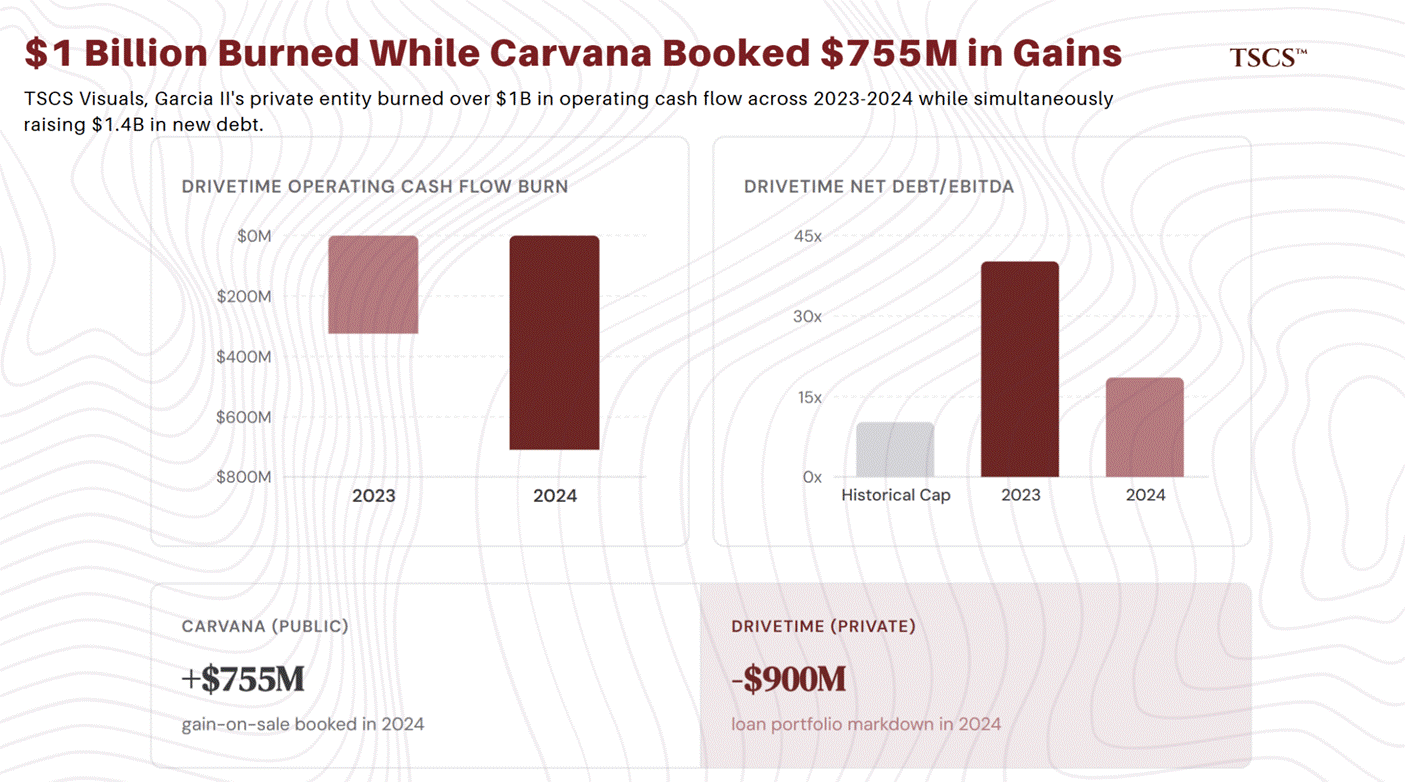 DriveTime (controlled by Ernest Garcia II, the CEO’s father) burned $324 million (2023) and $708 million (2024) in operating cash flow, over $1 billion combined, while simultaneously raising $1.4 billion in new debt. DriveTime’s net debt-to-EBITDA leverage exploded to 40.2x (2023) and 18.6x (2024), versus a historical cap of 10.3x. During this same period, Carvana booked $755 million in gain-on-sale of loans in 2024 alone, while DriveTime marked down its loan portfolio by $900 million, a concurrent divergence central to the manipulation allegation.