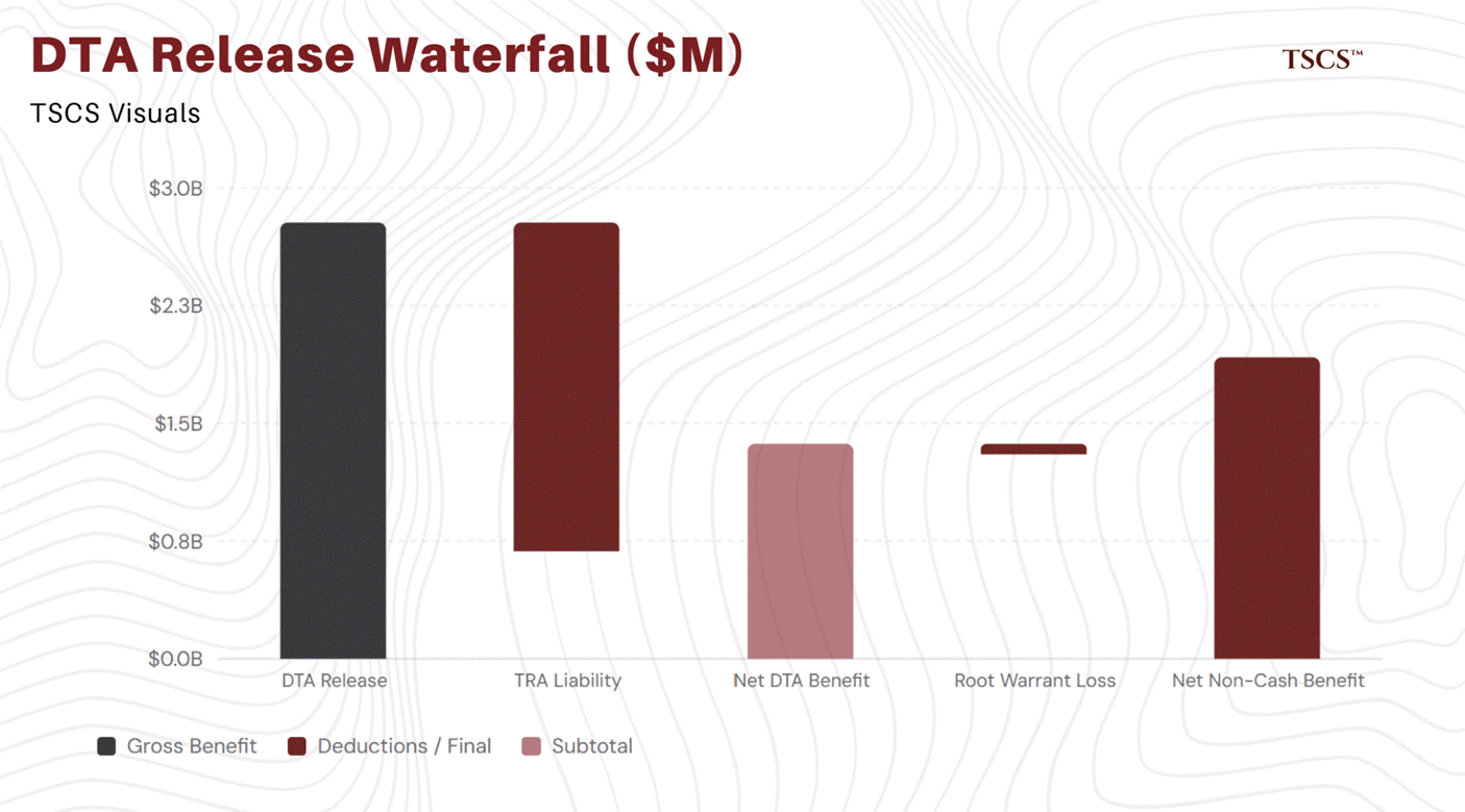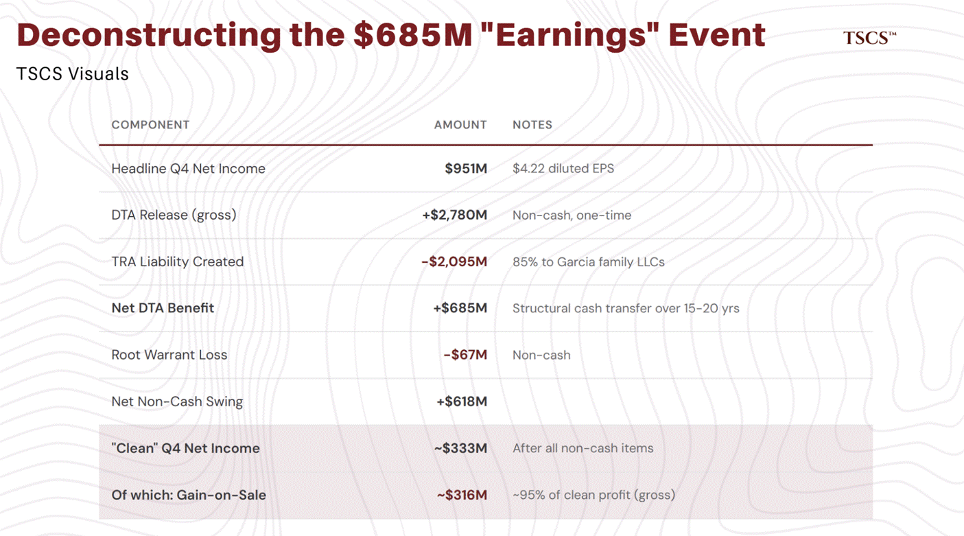 The headline Q4 net income of $951 million ($4.22 diluted EPS versus consensus of $1.13) was overwhelmingly driven by a one-time, non-cash event. In Q4, Carvana released the valuation allowance against its deferred tax assets, generating a gross income tax benefit of $2.78 billion. Because of Carvana’s Up-C corporate structure, 85% of tax savings must be shared with LLC unit holders via a Tax Receivable Agreement (TRA), creating a simultaneous $2.095 billion TRA liability. The net impact: a $685 million positive swing to net income. After subtracting a $67 million loss on Root Inc. warrants, the net non-cash benefit was $618 million.