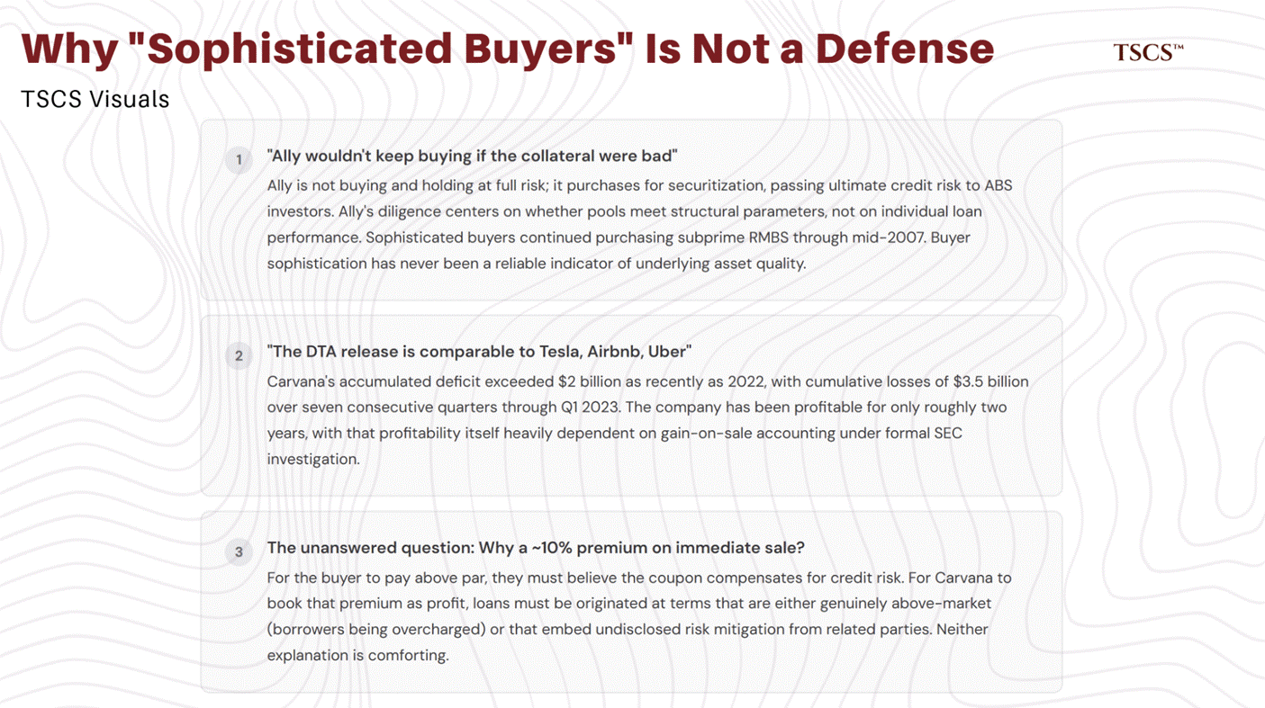 A frequent bull defense is that Ally Financial and other loan purchasers are sophisticated institutional investors who would not continue buying if the underlying collateral were deteriorating. This deserves serious engagement. The argument has surface appeal but collapses under scrutiny. Ally is not buying and holding these loans on its balance sheet at full risk; it is purchasing them for securitization, where the ultimate credit risk is passed to ABS investors. Ally’s due diligence centers on whether the loan pools meet the structural parameters of its securitization programs, not on whether each individual loan will perform.