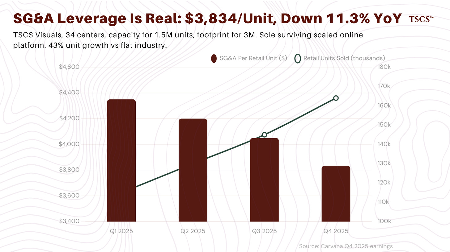 Carvana is achieving genuine SG&A leverage. Q4 SG&A per retail unit fell to $3,834, down 11.3% year-over-year, with improvements across compensation, advertising, and logistics. This is not accounting fiction; it reflects real operational scaling as the ADESA infrastructure absorbs higher volumes. The company now operates 34 inspection and reconditioning centers with built capacity for 1.5 million annual units, and management claims the real estate footprint supports 3 million. SG&A leverage at these volumes is the structural bear killer: if Carvana can push through to 1 million units with the current cost base, the profit math changes dramatically even without any improvement in GPU.