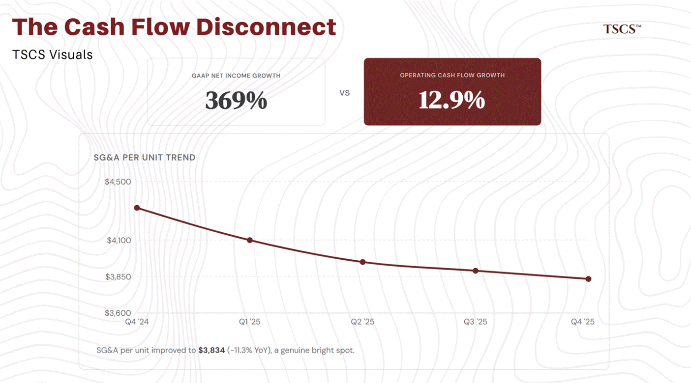 SG&A totaled $627 million (+26.9% YoY), though SG&A per unit improved to $3,834 (-11.3% YoY). Full-year operating cash flow of approximately $1.036 billion grew just 12.9%. GAAP net income grew 369%. When earnings grow 29 times faster than cash flow, the earnings are not real in any economically meaningful sense.