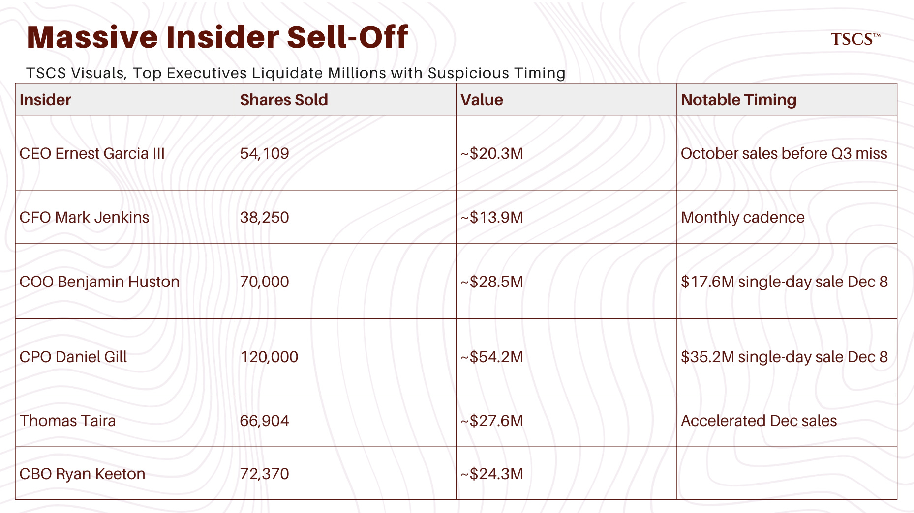 Hindenburg Research announced its closure in January 2025, shortly after publishing the Carvana report, meaning the original short-seller is no longer actively pressing the thesis or releasing follow-up research. This shifts the burden of maintaining public scrutiny to Gotham City Research and independent analysts. The insiders’ own behaviour suggests they take these allegations far more seriously than the sell-side does. The selling pattern at Carvana is among the most extreme in public markets.