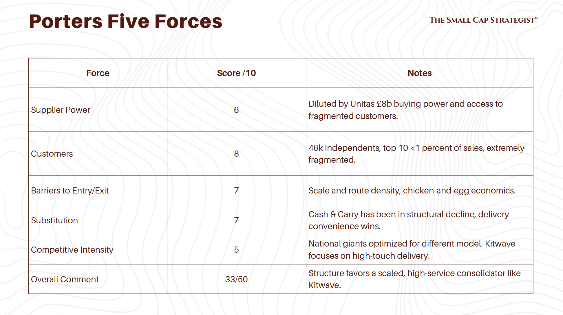 Niche but durable. Large rivals lack infrastructure for small mixed drops, regionals lack scale/reliability. Each acquisition deepens density, strengthens supplier terms, and broadens coverage, reinforcing a self-sustaining moat.