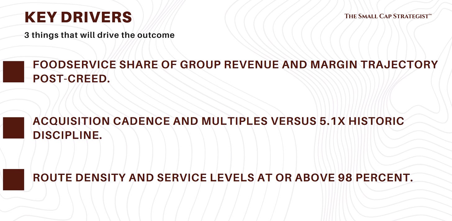 Thesis in one line: Repeatable 3 to 4 percent organic growth plus disciplined bolt-ons, rising foodservice mix, 98 percent service levels, 90 percent cash conversion, and low leverage create a durable compounder priced at a cyclical trough.