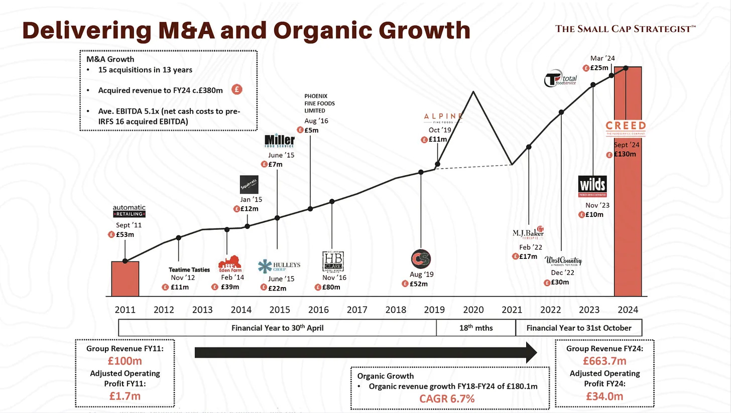 15 acquisitions over 13 years, disciplined prices, equity raise and RCF used to fund Creed. Dividends paid £7.9m FY24.