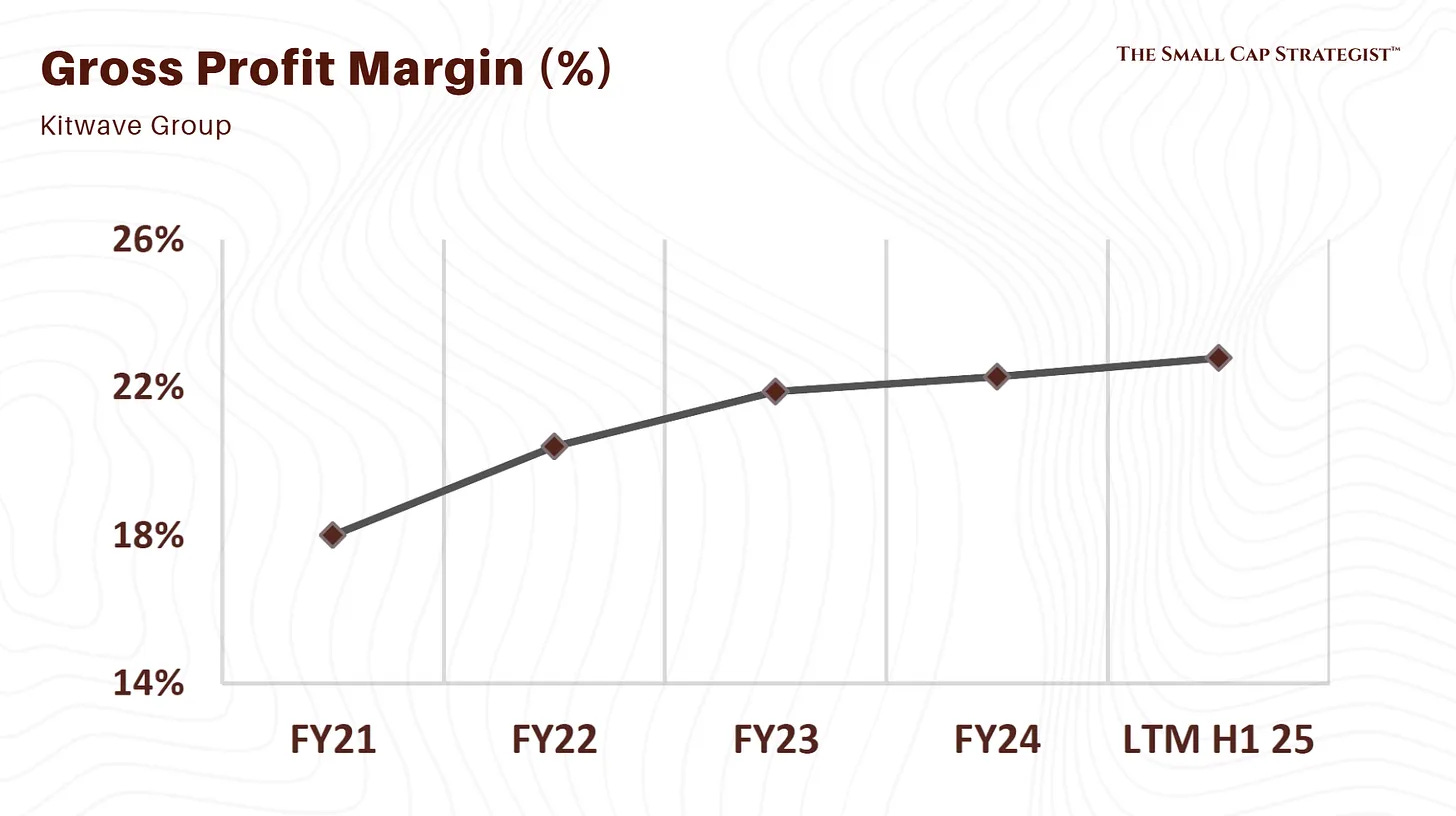 Gross margin expanded from 20.4 percent (FY22) to 22.6 percent (H1-FY25). Reliable service and fragmented customers enable consistent pass-through of supplier cost inflation. Broad basket allows cross-selling and upselling.