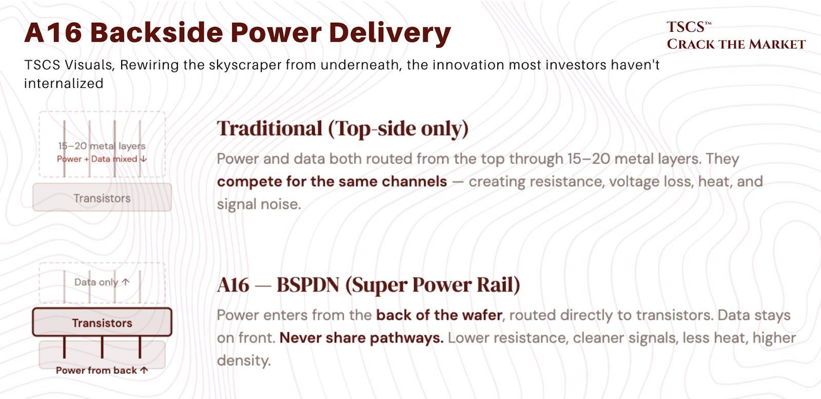 Beyond N2, TSMC’s A16 process (1.6nm class) introduces backside power delivery (BSPDN), branded as Super Power Rail. This is the second architectural breakthrough in two node generations, which is unprecedented.