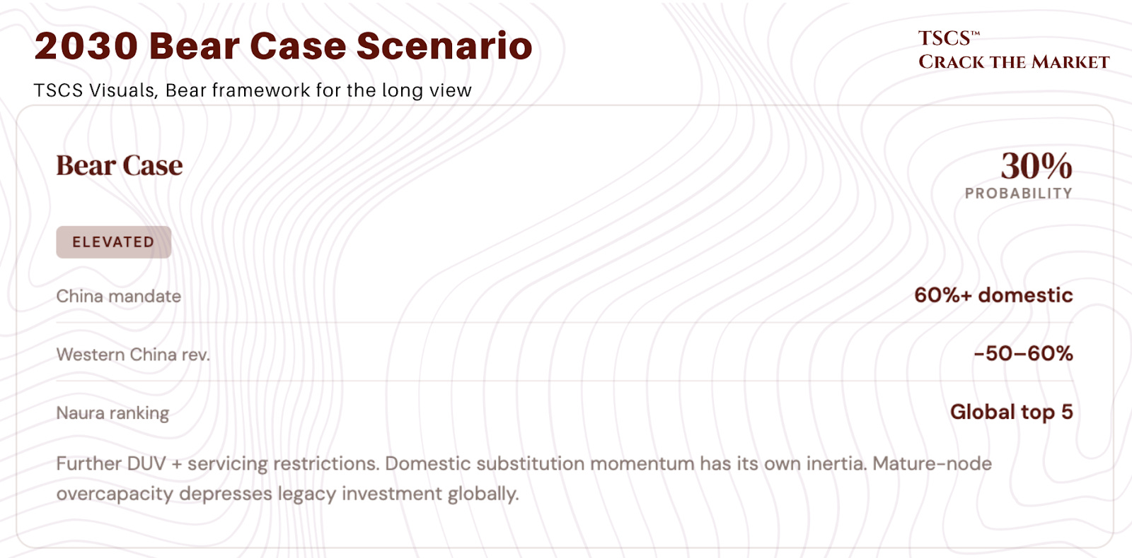 For portfolio positioning, KLA and ASML’s EUV franchise offer the most defensible moats. AMAT, Lam, and TEL carry the most structural risk from domestic substitution. The sector is not uninvestable (global WFE is projected to grow to $135-184 billion by 2030), but the China tailwind that drove 30-45% revenue shares at peak is not coming back. Investors pricing these stocks on a 9% WFE CAGR without adjusting for the mix shift are, in our view, making a mistake.