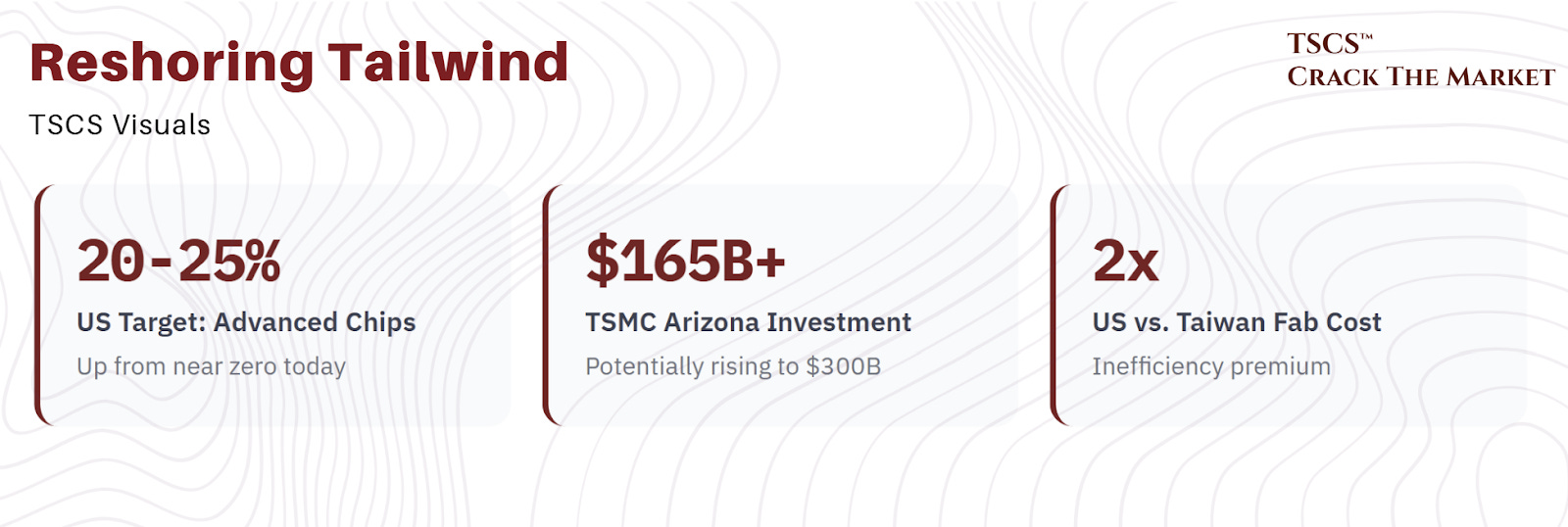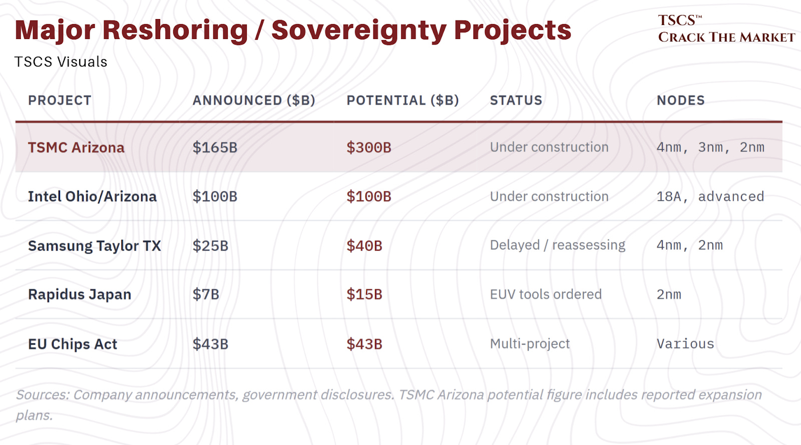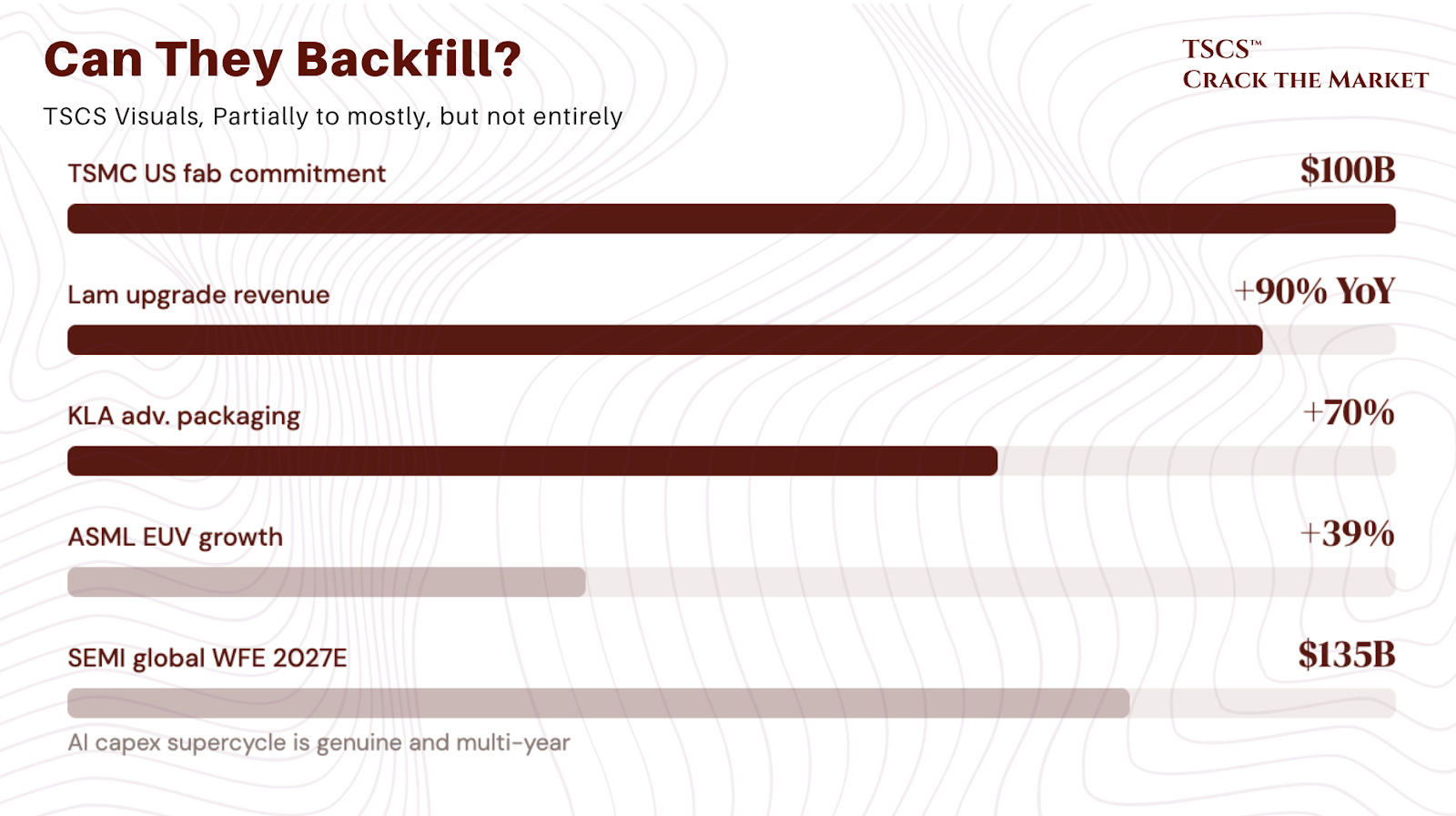We think this risk is low in the near term: TSMC needs equipment companies as much as they need TSMC, lead times of 18-24 months for EUV systems give equipment makers structural leverage, and Samsung and Intel both have stated commitments to advanced node investment that make full exit unlikely before 2028. But it is the correct long-term bear case for the sector that almost nobody discusses, and investors pricing semicap stocks at 35x forward earnings should at least be aware of it.