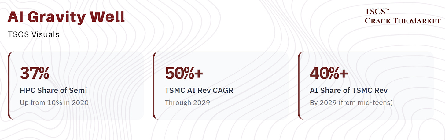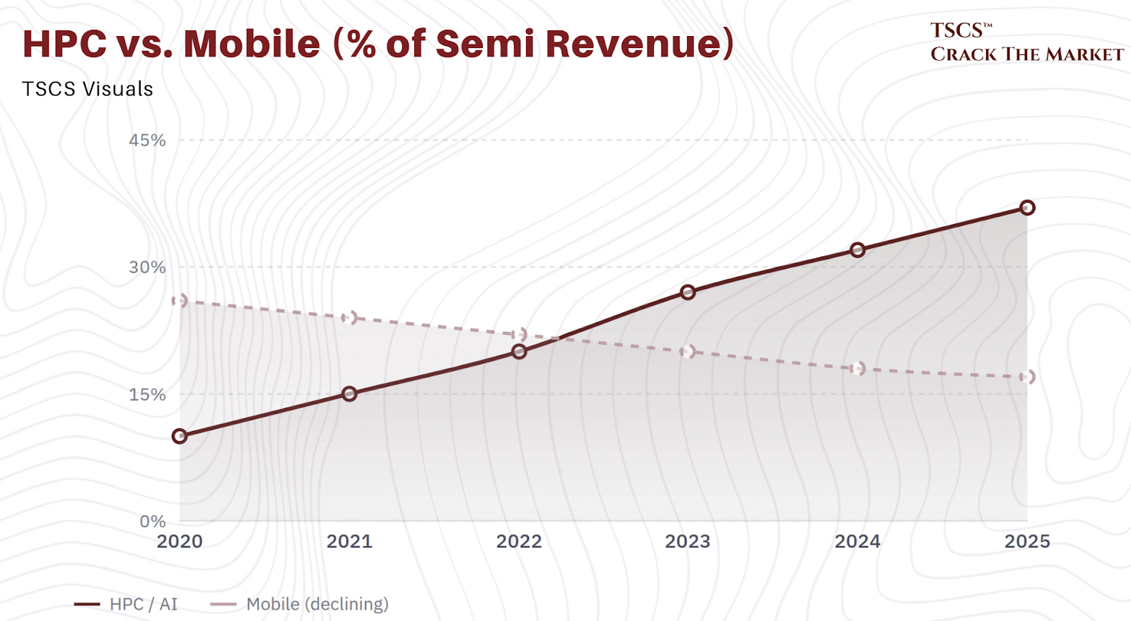 The shift is dramatic. HPC (High Performance Computing) grew from 10% of core semiconductor revenue in 2020 to 37% in 2025, overtaking mobile’s decline from 26% to 17% over the same period. The customer base has fundamentally changed: from price-sensitive consumers optimizing cost to hyperscalers and enterprises optimizing compute performance at nearly any price. This is not a subtle shift. It is a regime change in who writes the checks and what they are willing to pay.