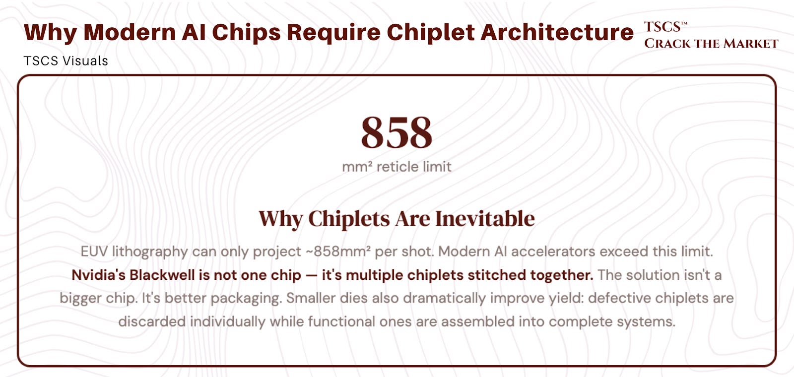 The era of the single monolithic chip is effectively finished. EUV lithography can only project a finite field of view (roughly 858 square millimeters, the reticle limit), meaning it is physically impossible to print a chip larger than that in one shot. Modern AI accelerators demand computational brains that exceed this limit. Nvidia’s Blackwell is not one chip. It is multiple chiplets stitched together into a single system.