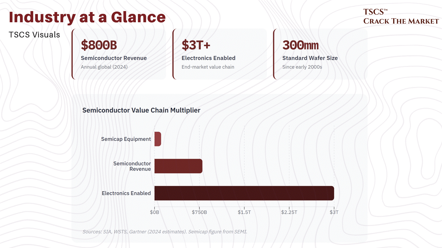 Everything you touch that requires electricity contains a semiconductor. Your phone. Your car. Your washing machine. The traffic lights on your commute. The power grid keeping the lights on while you read this. Semiconductors are not a “sector.” They are the substrate on which modern civilization operates, and the $800 billion they generate in annual revenue is a rounding error relative to the $3 trillion electronics value chain they enable.