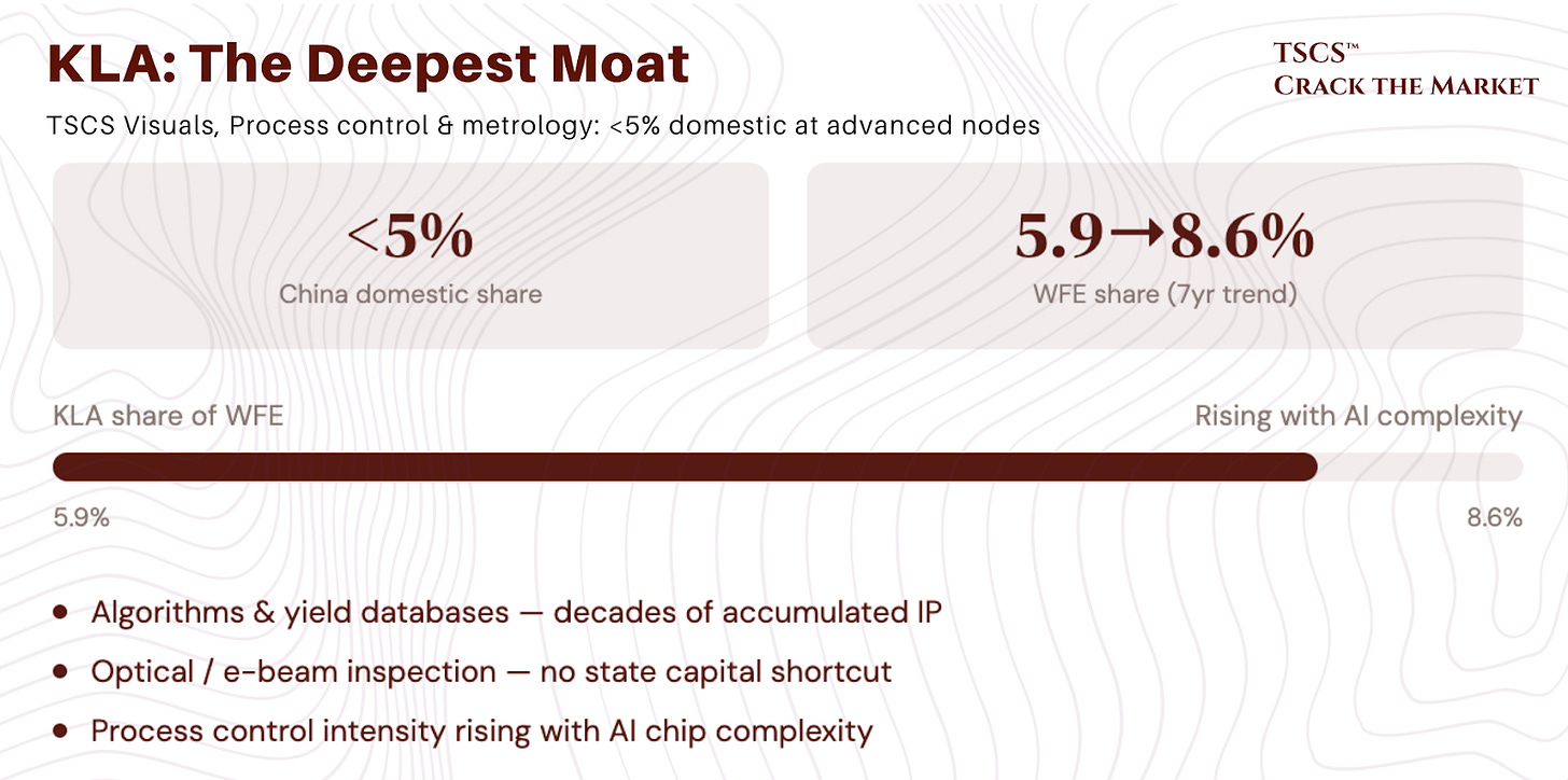 TSCS view: Process control intensity rising from 5.9% to 8.6% of total WFE over seven years is one of the most structurally significant data points in the semicap space, and it only moves in one direction. As chips get more complex, more layers and smaller features mean more opportunities for defects and higher costs when defects slip through. KLA’s dominance here is worth understanding in detail, and we return to it extensively in the China section, where the moat’s imperviousness to domestic substitution becomes the central analytical point. For now, note that this is the one equipment category where Chinese self-sufficiency remains below 5% at advanced nodes, and where the barriers to entry are not capital but accumulated decades of proprietary yield data. We will explain why later in this piece.