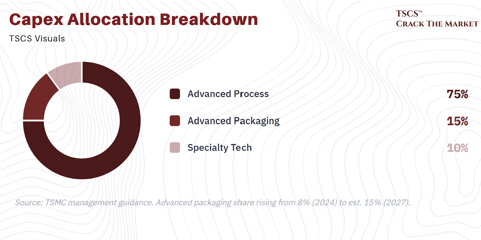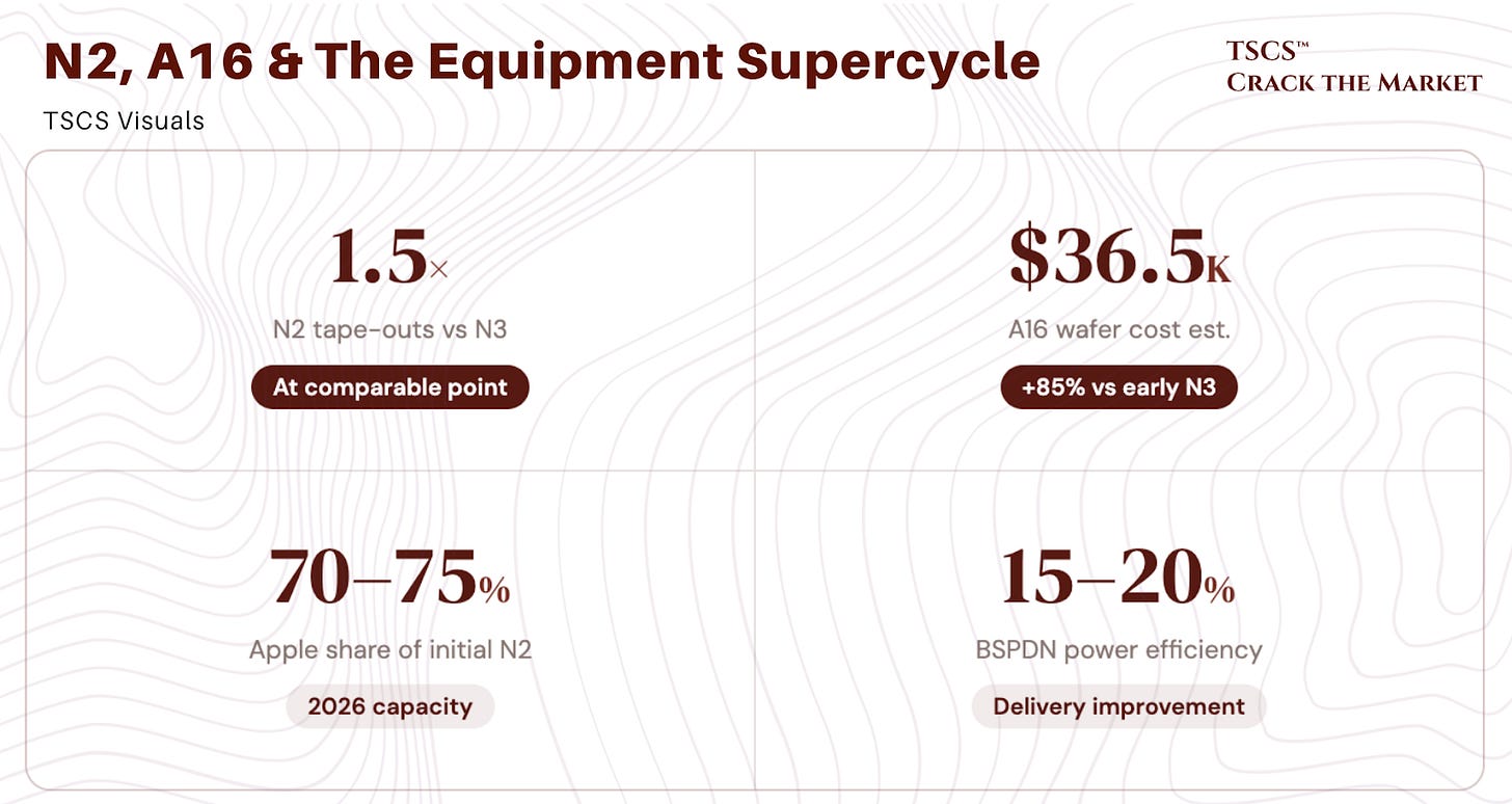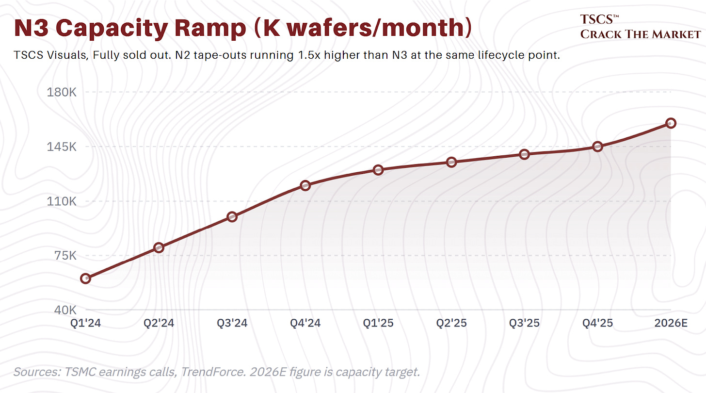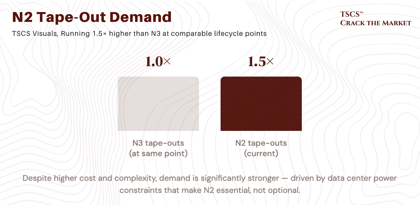Demand confirms this. N2 tape-outs are running 1.5x higher than N3 at comparable lifecycle points, despite higher cost and complexity. Apple is expected to absorb 70 to 75% of initial N2 capacity in 2026, with AMD and other HPC customers following. TSMC is building N2 capacity knowing it will be fully utilized before the first wafer ships.