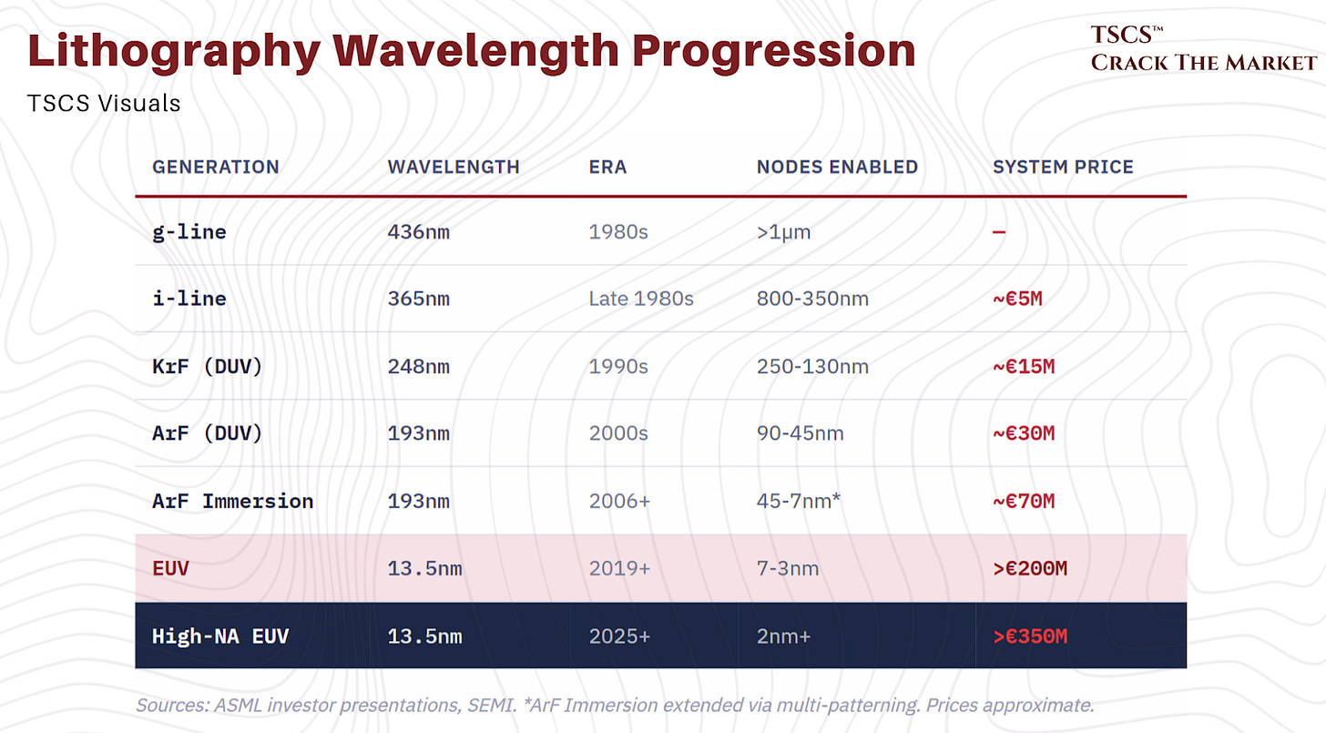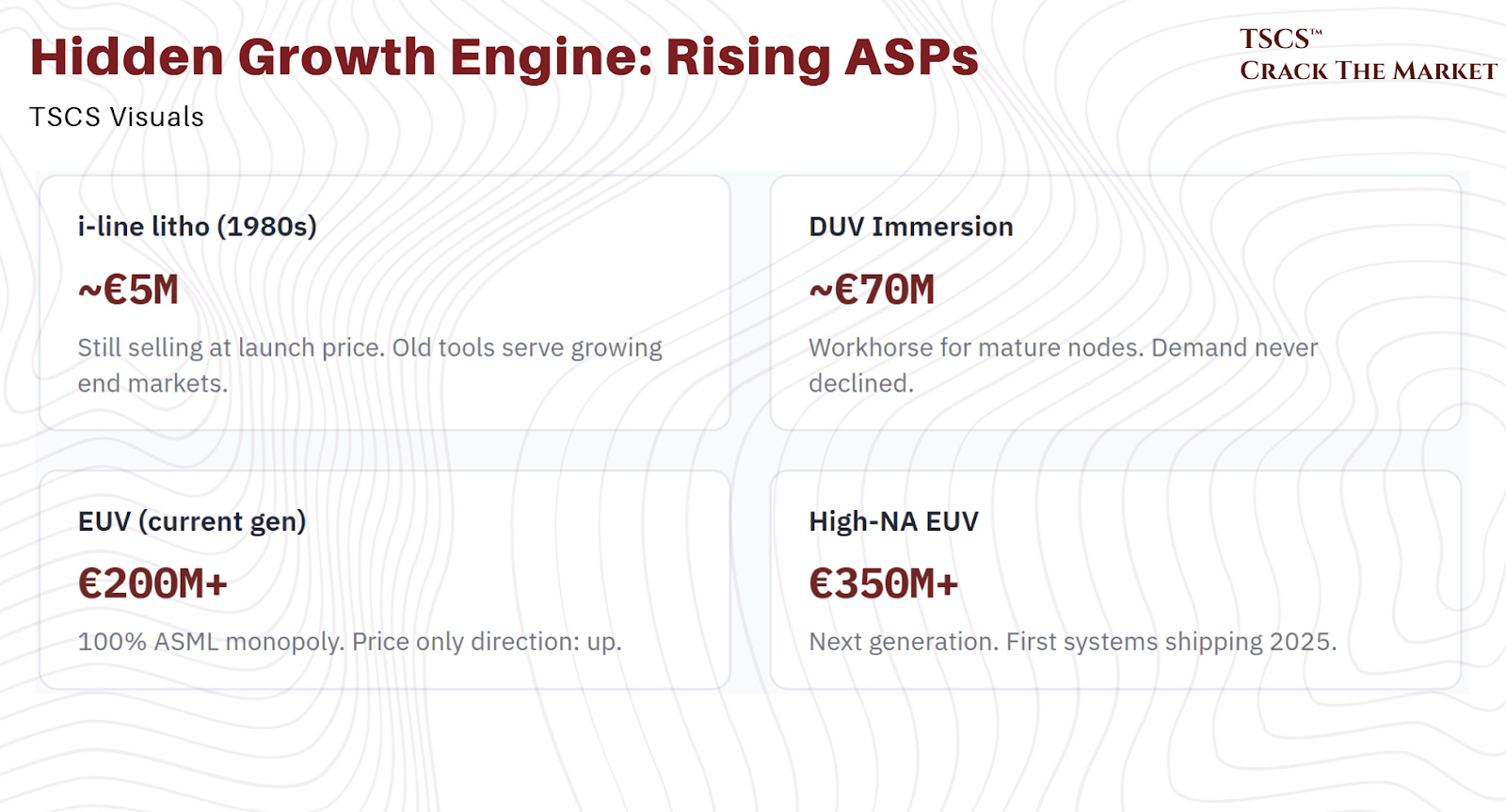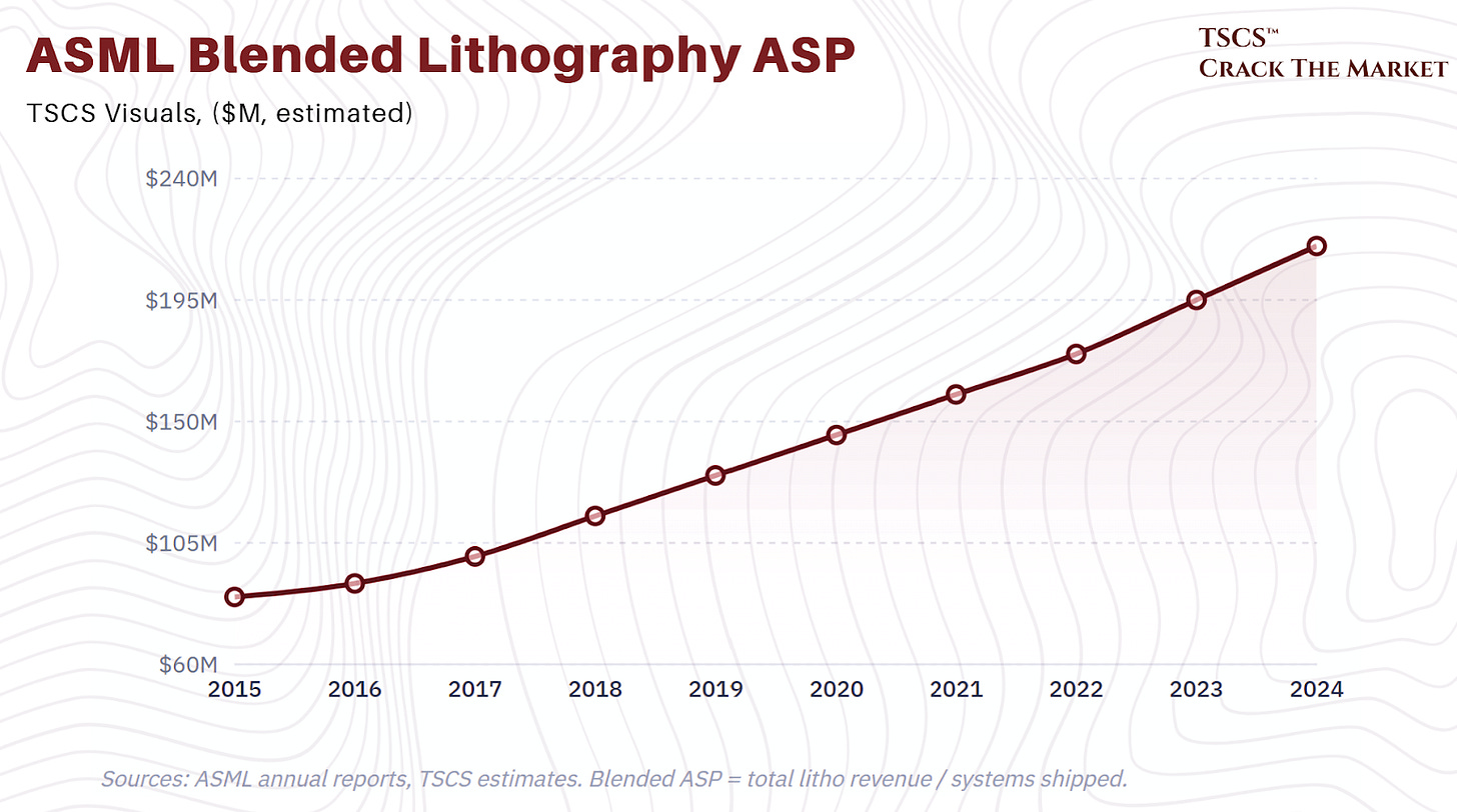 EUV solved this. A 13.5nm wavelength prints features directly at the required scale. ASML is the only company on earth that makes EUV lithography systems. Its current-generation EUV tools cost over $200 million each. Its next-generation High-NA EUV systems exceed $350 million. The blended ASP of ASML’s lithography systems has been rising at 10 to 15% CAGR for years. The price of any lithography generation never falls. I-line systems introduced in the late 1980s at roughly €5 million are still selling at roughly €5 million today.