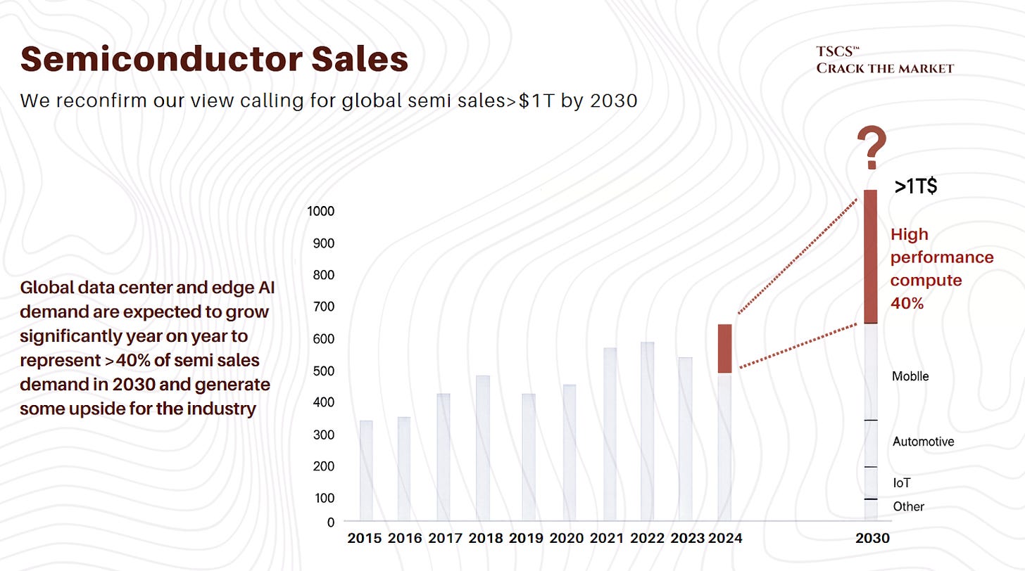 The semiconductor market is projected to grow from $800 billion today to over $1 trillion by 2026 and $1.25 trillion by 2028, driven by data centers, automotive, and industrial applications. The dominant growth engine is servers, data centers, and storage, estimated at a 14% CAGR versus 9% for the overall market.