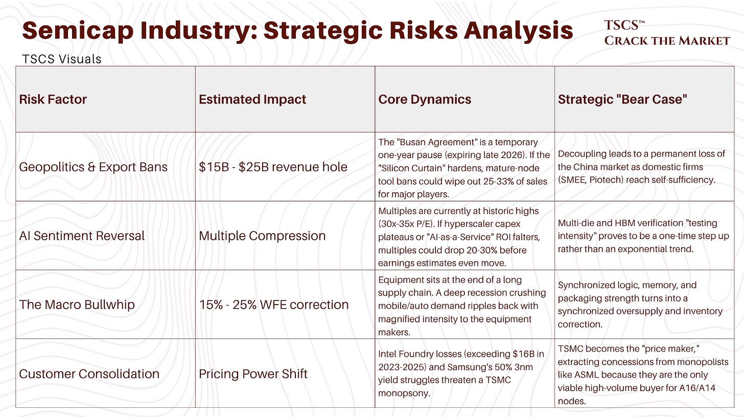 Geopolitics is number one. If the US bans all equipment exports to China, including mature-node tools, that is a $15 to 25 billion revenue hole across the industry. China still represents a quarter to a third of sales for most semicap companies. The Busan agreement was a tactical pause, not a structural resolution.