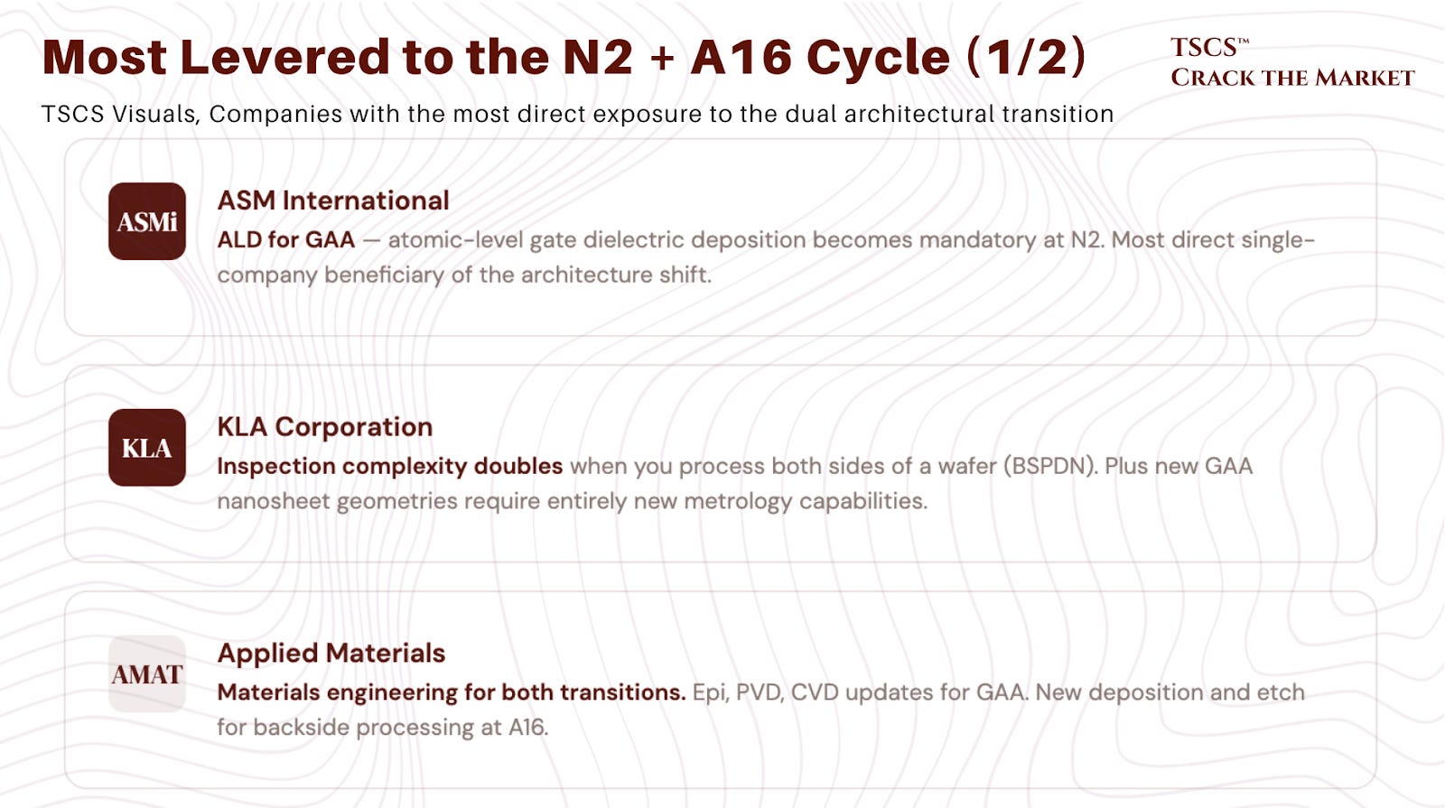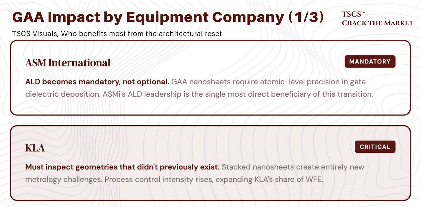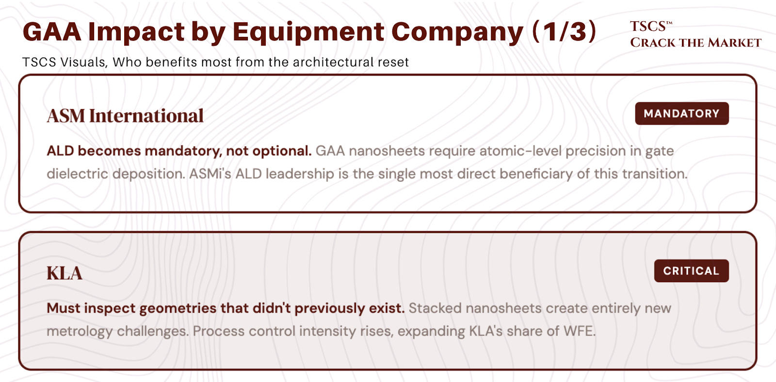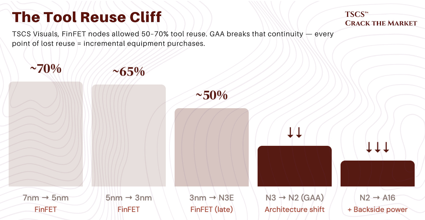 TSCS view: The FinFET-to-GAA transition is, for semicap investors, the most important technology event since EUV insertion at 7nm. Here is why. FinFET nodes (7nm through 3nm) used essentially the same transistor architecture, which allowed 50 to 70% tool reuse between generations. GAA breaks that continuity. New deposition techniques (ASMi’s ALD becomes mandatory, not optional). New etch profiles (Lam and TEL must cut through nanosheet stacks rather than fins). New metrology requirements (KLA must inspect geometries that did not previously exist). New materials. The tool reuse rate at N2 drops substantially, and every percentage point of lost reuse translates directly into incremental equipment purchases. This is why we flagged the tool reuse cliff earlier in this piece. The GAA transition is the mechanism.