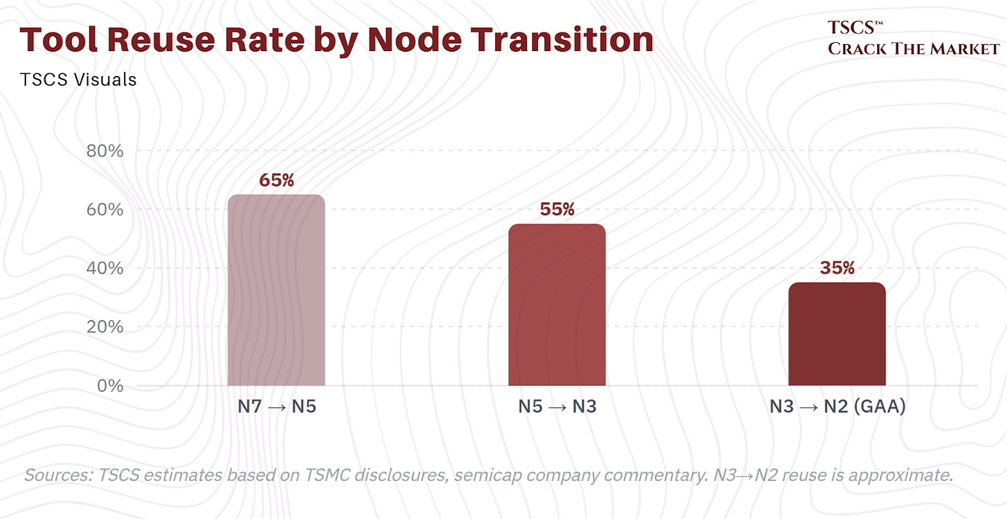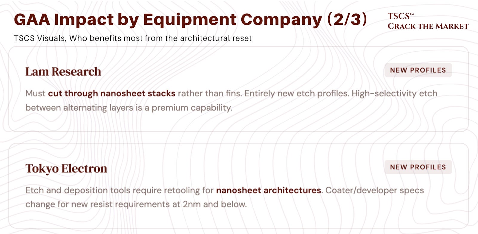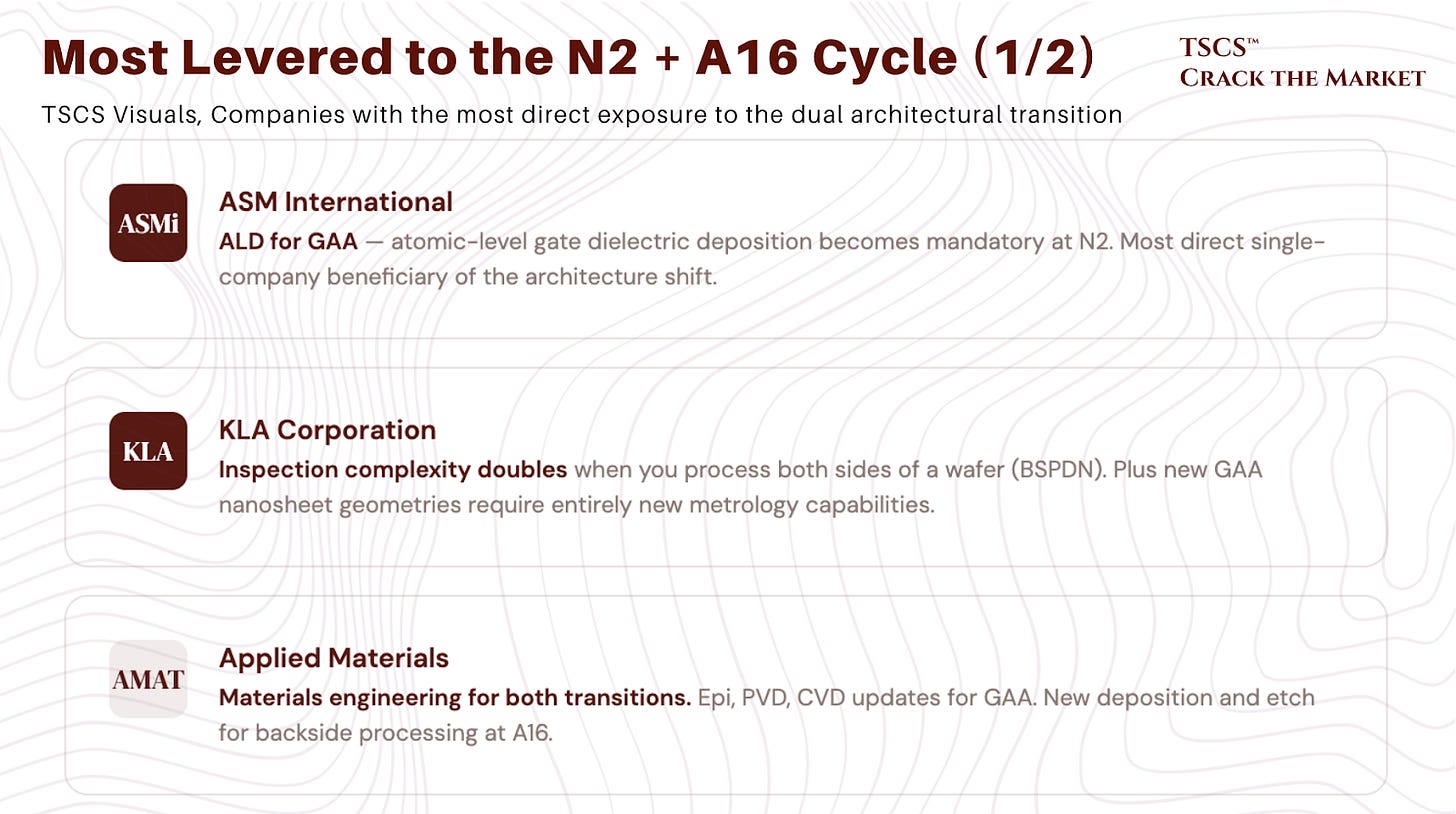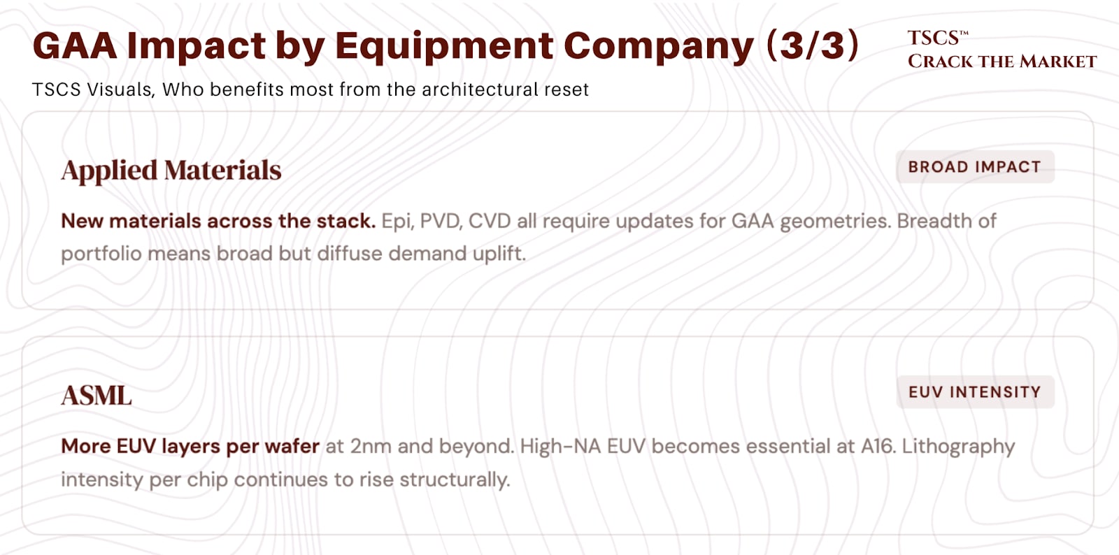 TSCS view: The FinFET-to-GAA transition is, for semicap investors, the most important technology event since EUV insertion at 7nm. Here is why. FinFET nodes (7nm through 3nm) used essentially the same transistor architecture, which allowed 50 to 70% tool reuse between generations. GAA breaks that continuity. New deposition techniques (ASMi’s ALD becomes mandatory, not optional). New etch profiles (Lam and TEL must cut through nanosheet stacks rather than fins). New metrology requirements (KLA must inspect geometries that did not previously exist). New materials. The tool reuse rate at N2 drops substantially, and every percentage point of lost reuse translates directly into incremental equipment purchases. This is why we flagged the tool reuse cliff earlier in this piece. The GAA transition is the mechanism.