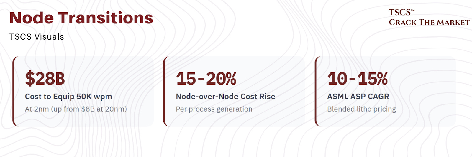 TSCS view: ASML’s pricing power is not a function of monopoly rent-seeking. It is a function of the value its machines create. A single EUV system costing $200 million enables the production of wafers worth tens of billions of dollars over its lifetime. The tool-to-output ratio is so extreme that customers would pay more, and ASML knows it, which is why ASPs keep climbing. The “nm” designation for chips has become essentially symbolic at this point (a “3nm” chip does not have 3nm features), but what has not become symbolic is the cost curve. Each node transition requires more EUV layers, more passes, more sophisticated optics. As we showed in the capex section, equipment cost per 1,000 wpm has more than doubled in two node generations, and lithography is the single largest contributor to that escalation. For investors, ASML’s question is not “will demand grow?” (it will), but whether the 2026 China revenue decline creates a buying opportunity before the 2027/2028 High-NA ramp fully materializes. We think the answer is probably yes, but the timing is tricky.