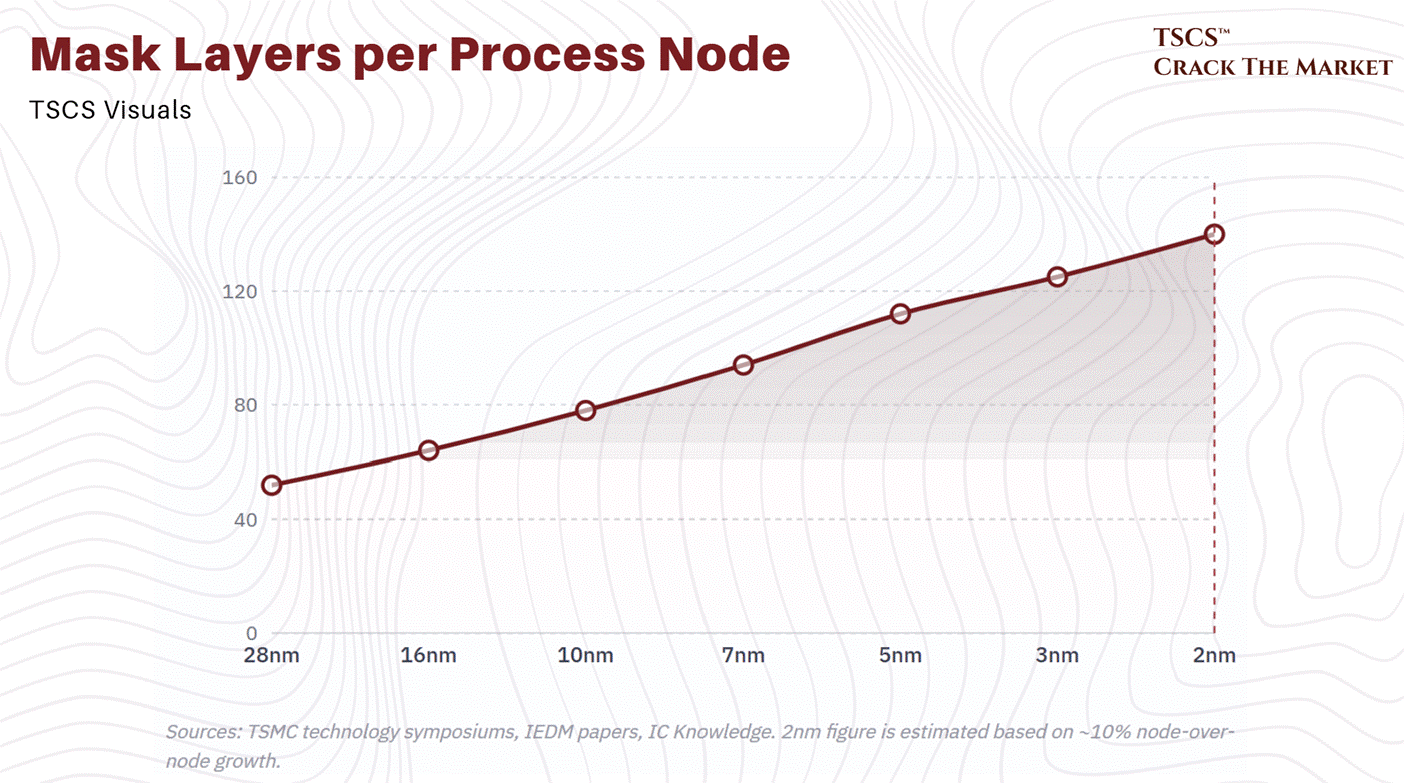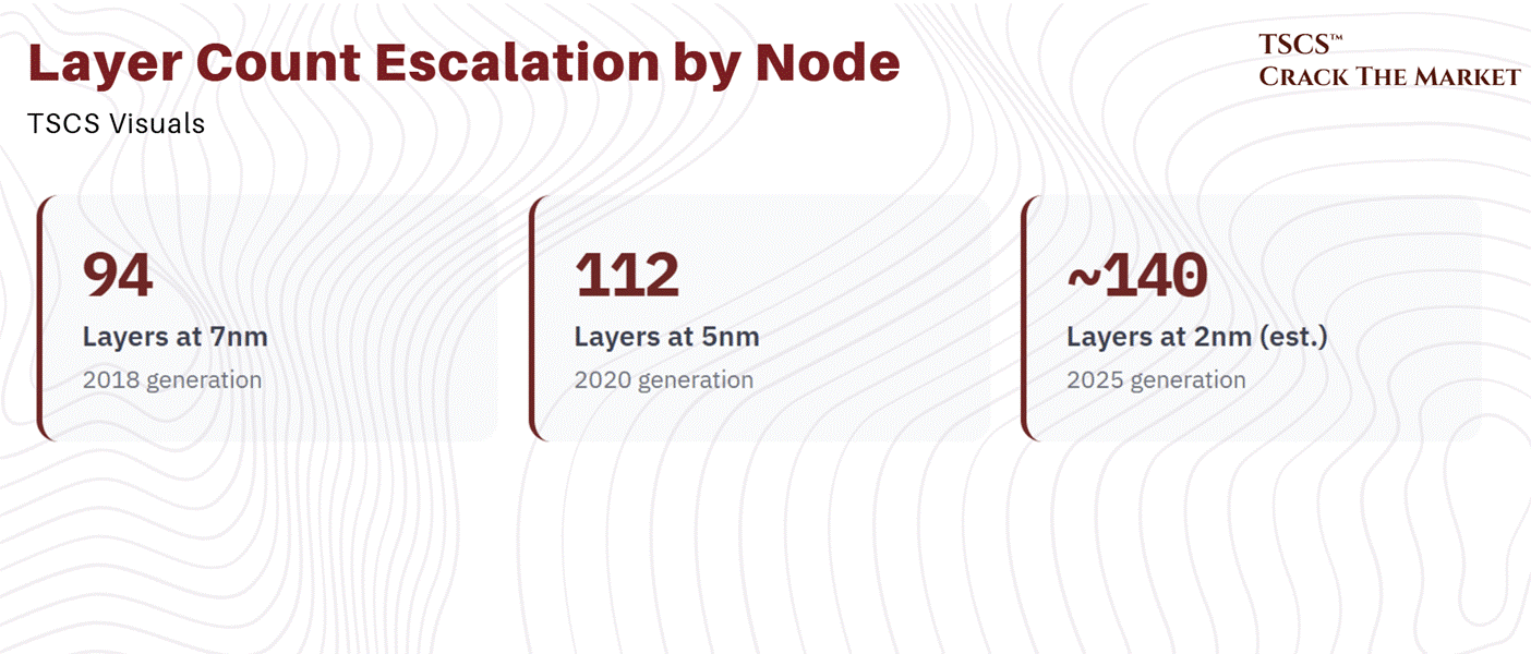 For every new manufacturing node, the number of layers increases by roughly 10%. A 7nm chip has 94 layers. A 5nm chip has 110 to 115. The trajectory is obvious and relentless: more layers, more complexity, more equipment required per wafer, more revenue per tool for the companies making the machines.