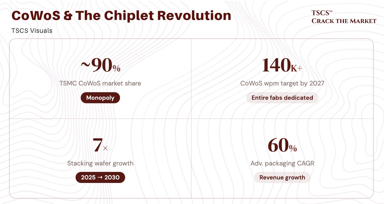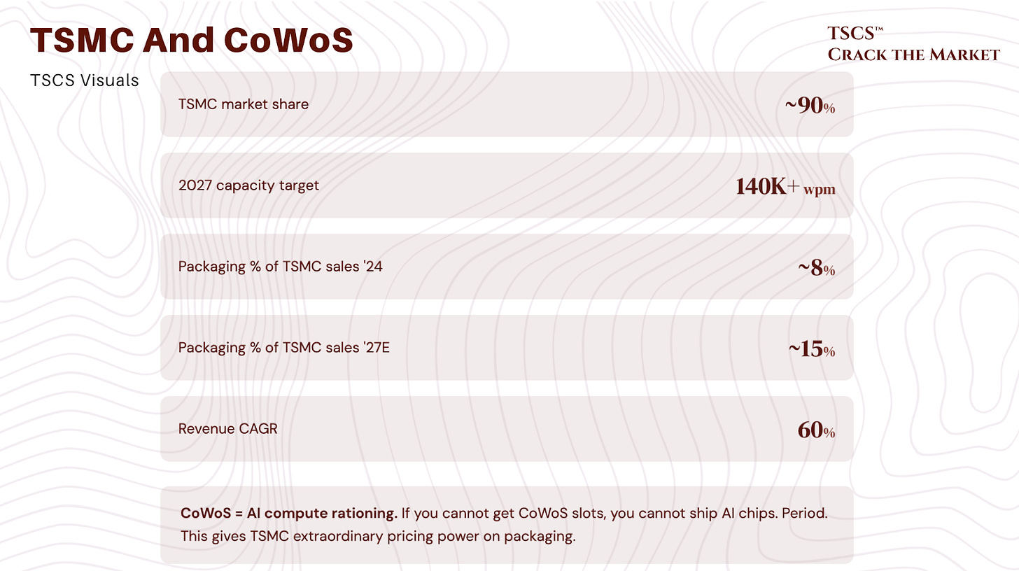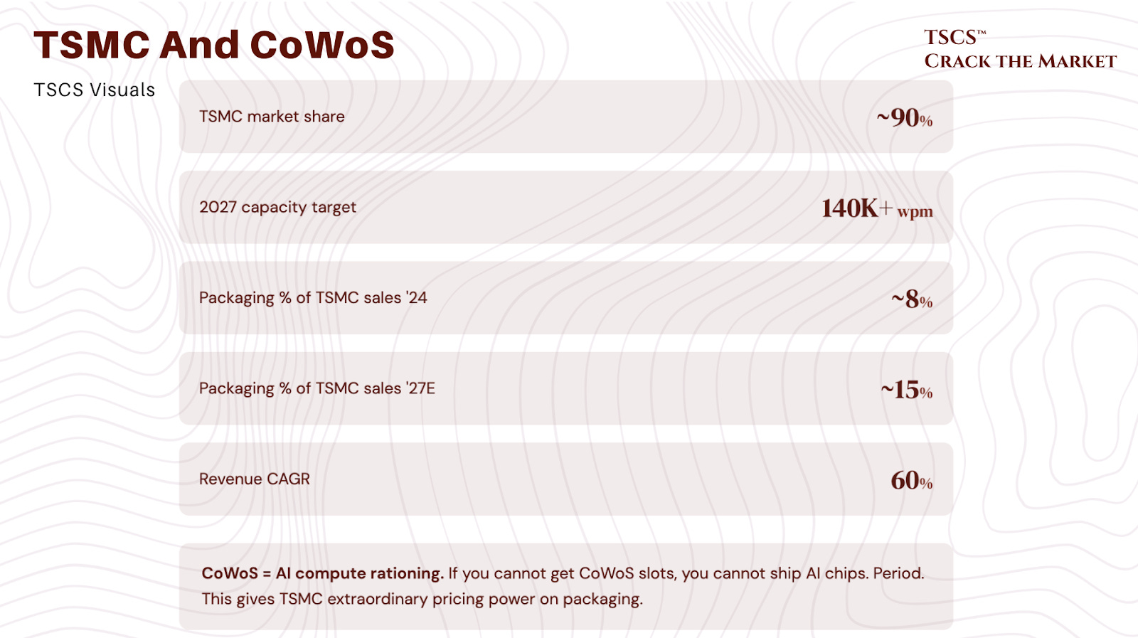 TSCS view: CoWoS capacity allocation is, in practice, how TSMC rations access to AI compute. If you cannot get CoWoS slots, you cannot ship AI chips. Period. This gives TSMC extraordinary pricing power on packaging, which is showing up in the numbers: advanced packaging revenue expanding at a 60% CAGR from 8% of sales in 2024 to an estimated 15% by 2027. The investment implication is that back-end equipment is no longer a secondary consideration. It is a primary growth driver. The companies supplying tools into TSMC’s CoWoS expansion (deposition, lithography for interposers, bonding, grinding, testing) are seeing order growth that rivals or exceeds the front-end equipment cycle.