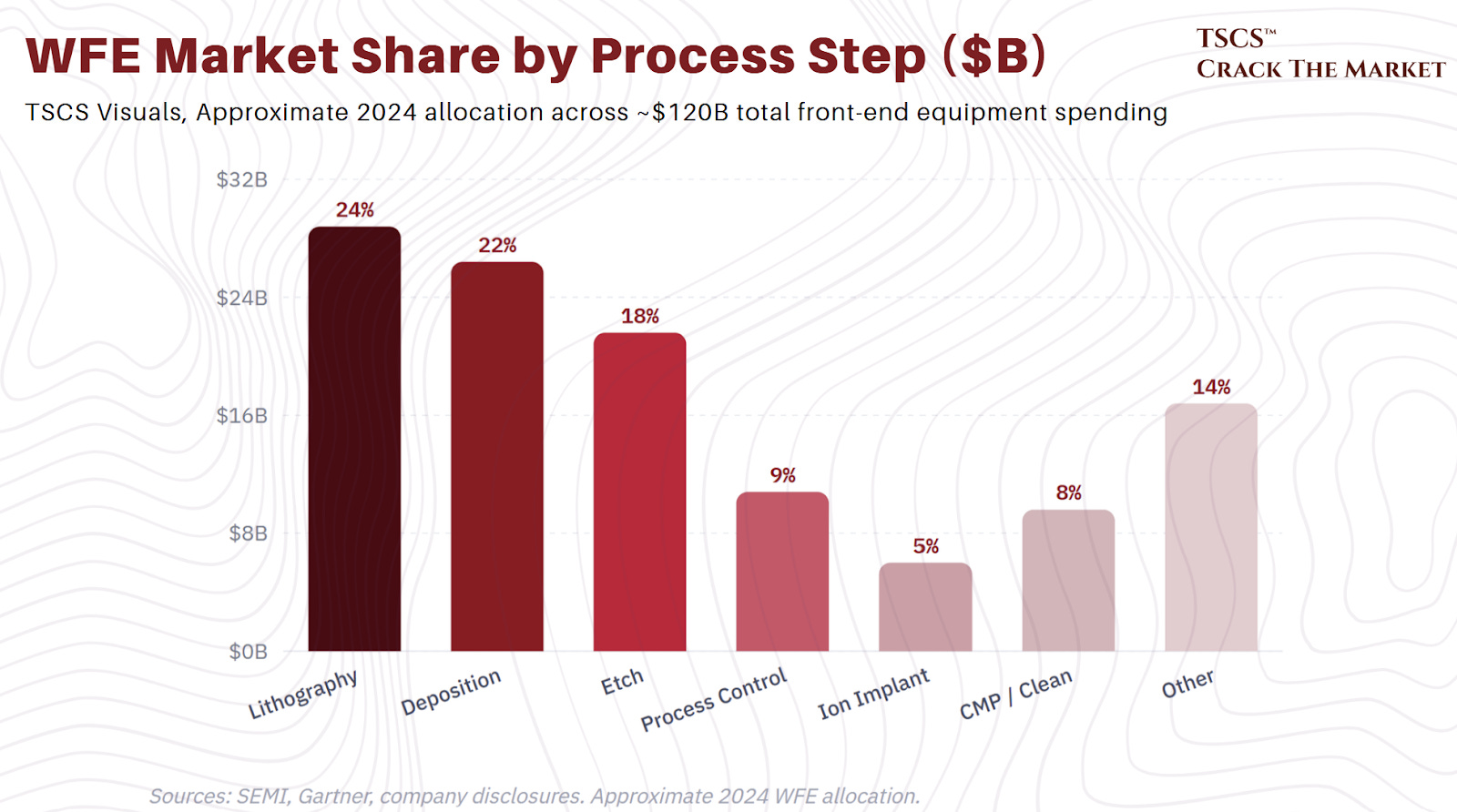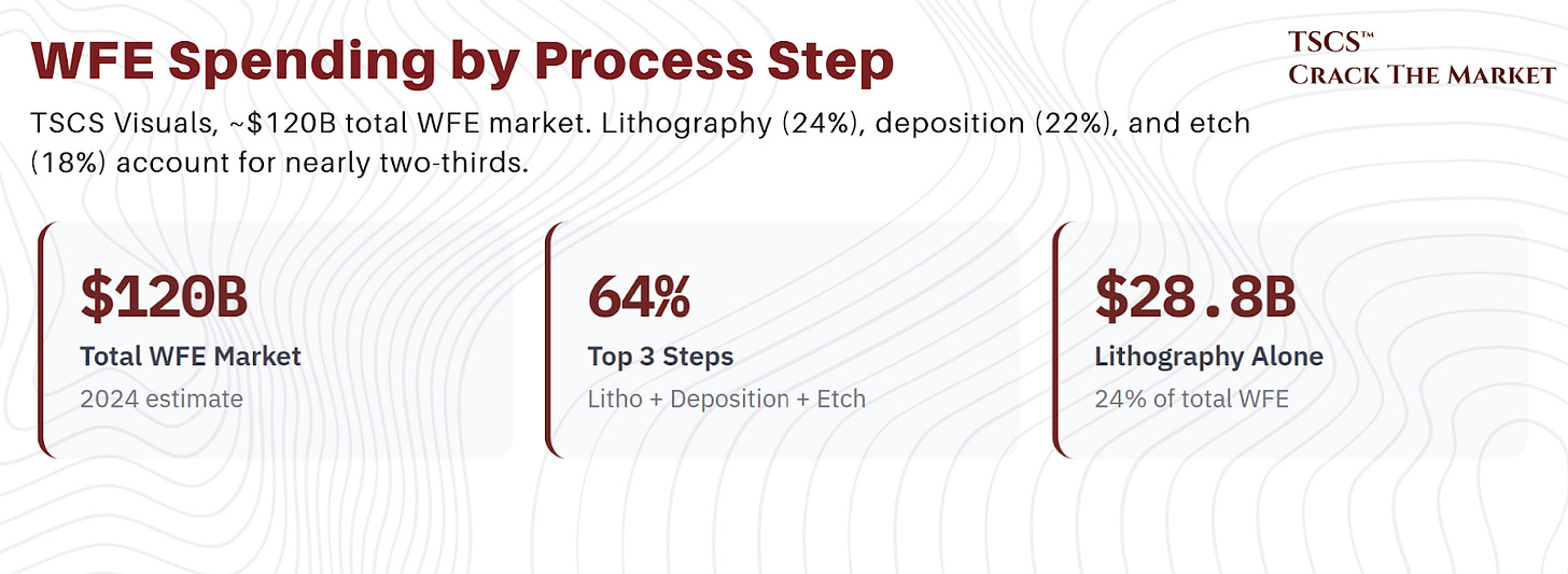 Lithography deserves its own treatment because it accounts for 24% of WFE spending and because ASML’s monopoly is the single most important competitive dynamic in the industry.