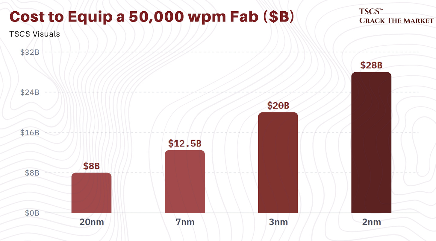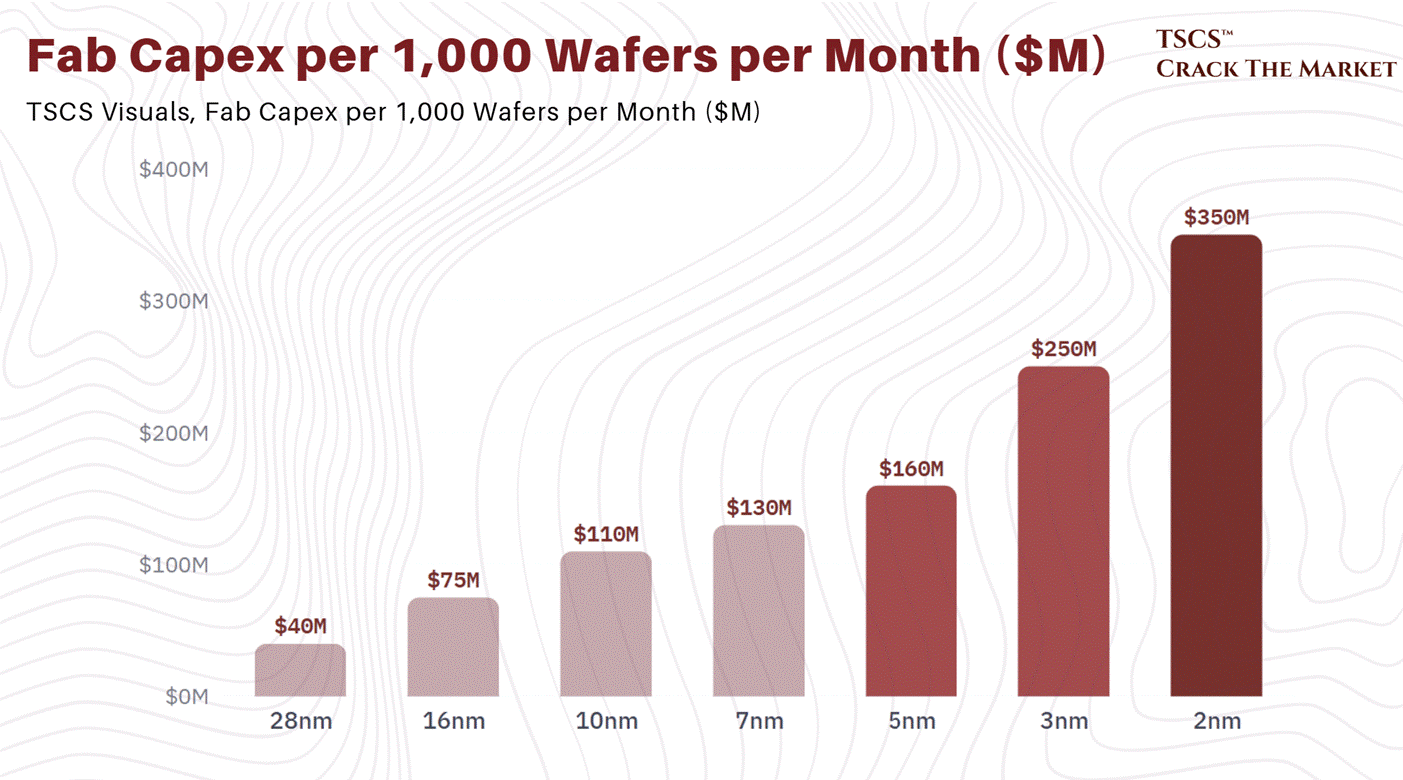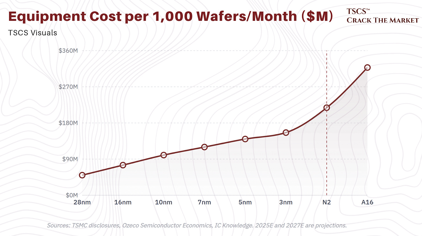 Our view: The layer count escalation is one of those deceptively simple data points that tells you almost everything about the semicap investment case. Every additional layer means another pass through deposition, lithography, etch, and inspection equipment. A 10% increase in layers per node does not translate to a 10% increase in WFE demand (tool reuse, efficiency gains, and batch processing all matter), but it does translate to structurally rising equipment intensity per wafer. This is the compounding engine underneath the semicap growth story and it is remarkably difficult to disrupt, because the physics of making thinner, taller structures requires more precise tools, not fewer. As Ozeco details later in this piece, 2nm capacity expansion now costs $350m per 1,000 wafers per month versus $160m for 5nm. That is not inflation. That is physics.