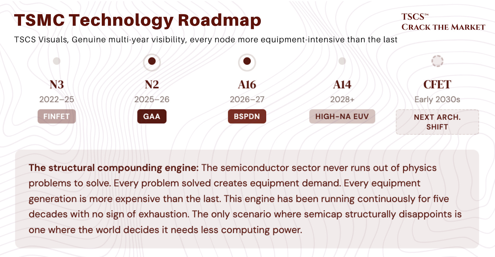 The semiconductor sector never runs out of physics problems to solve. Every problem solved creates equipment demand. Every equipment generation is more expensive than the last. This is the structural compounding engine underneath the semicap investment thesis, and it has been operating continuously for five decades with no sign of exhaustion.