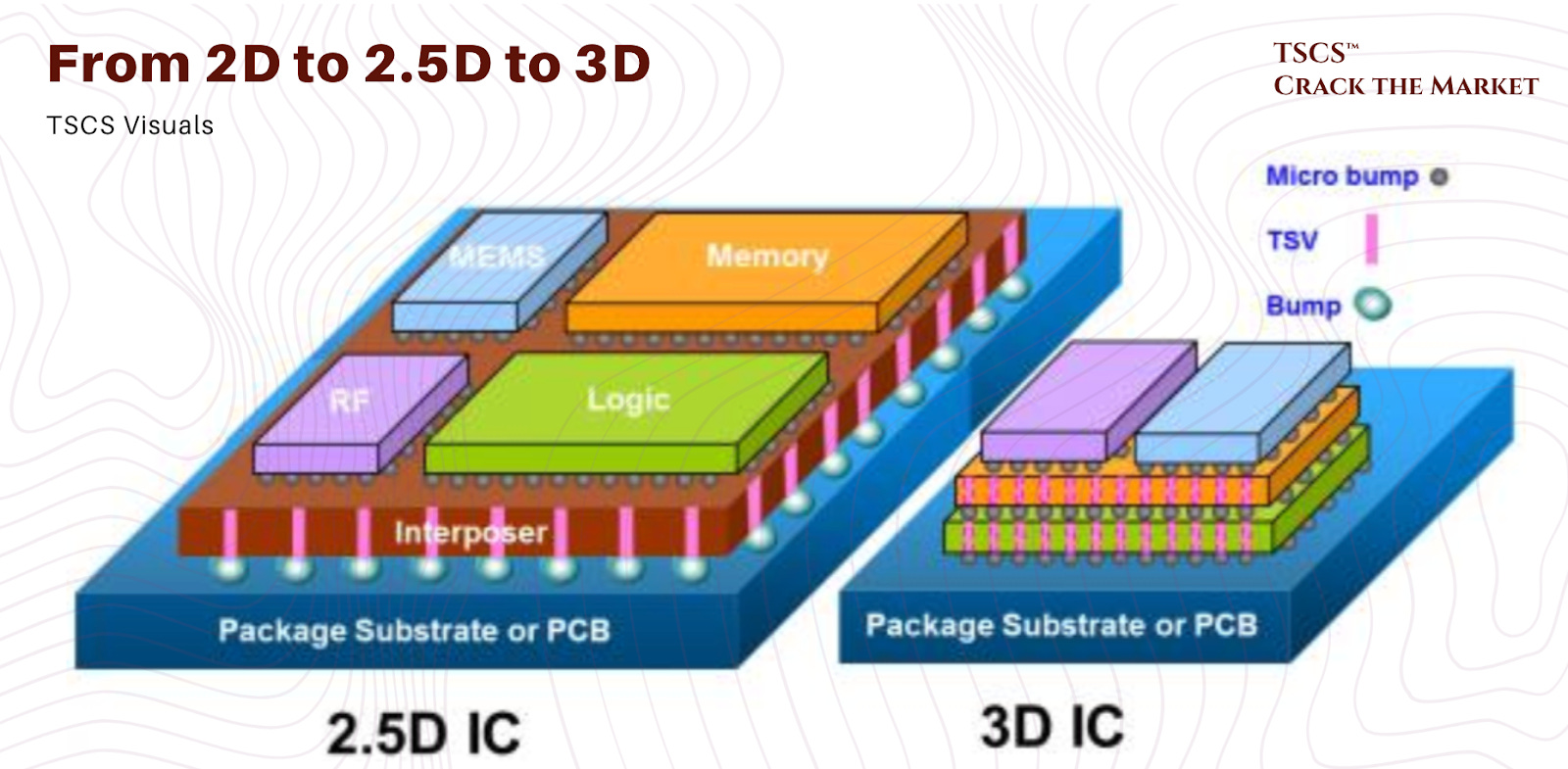 CoWoS is 2.5D: multiple dies sitting side by side on an interposer. The next step is true 3D: dies stacked directly on top of each other.