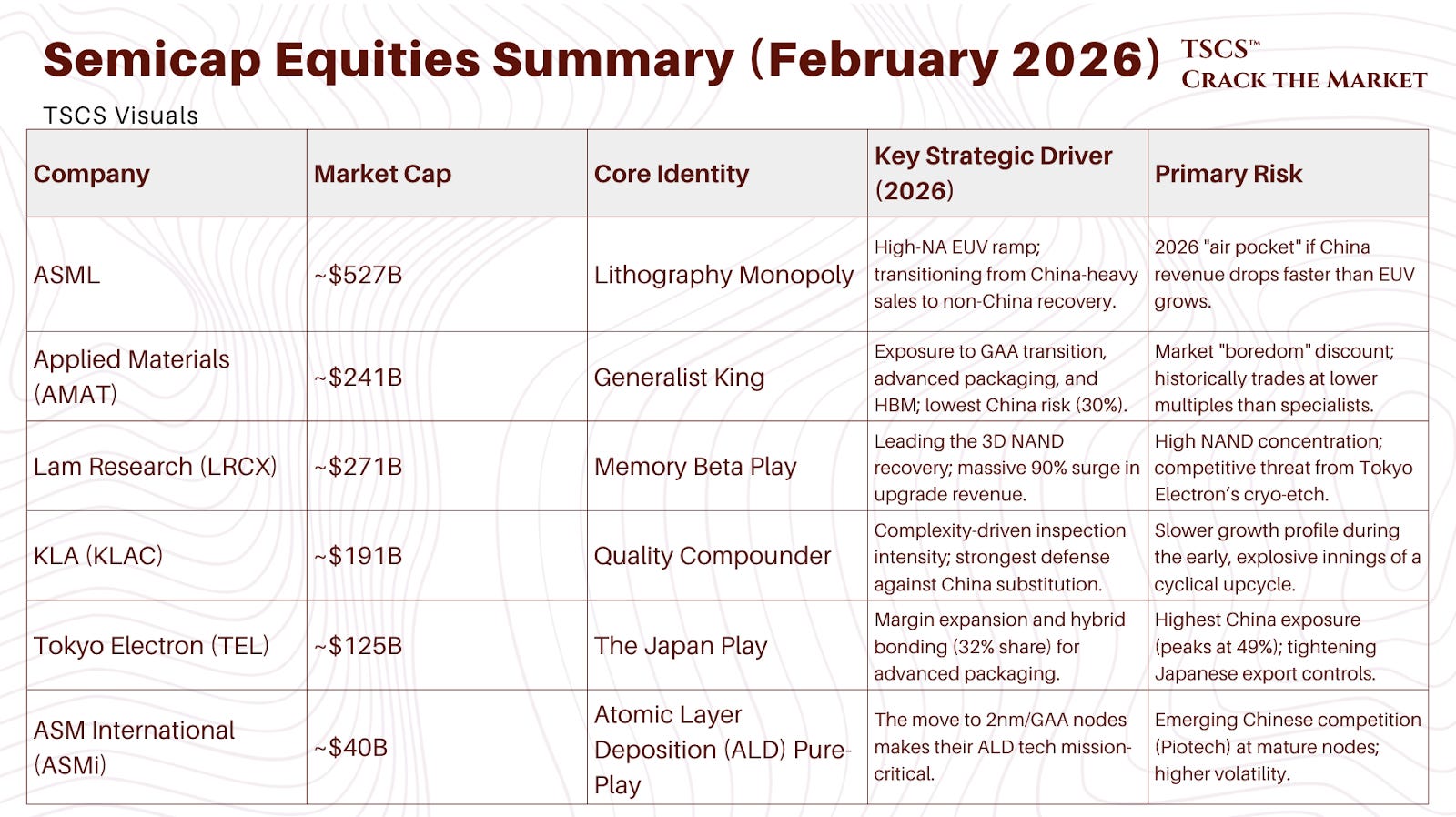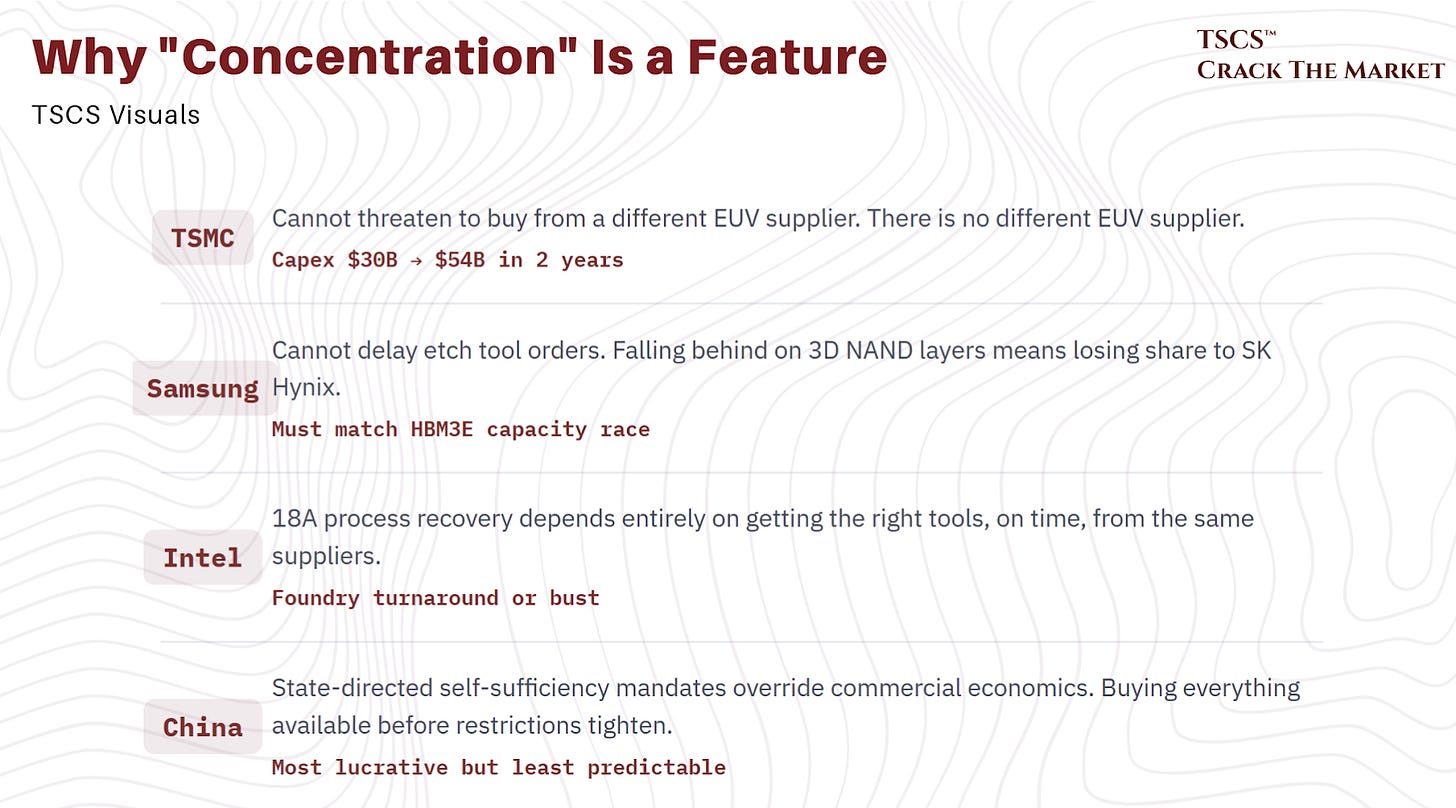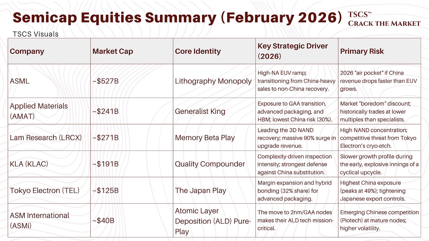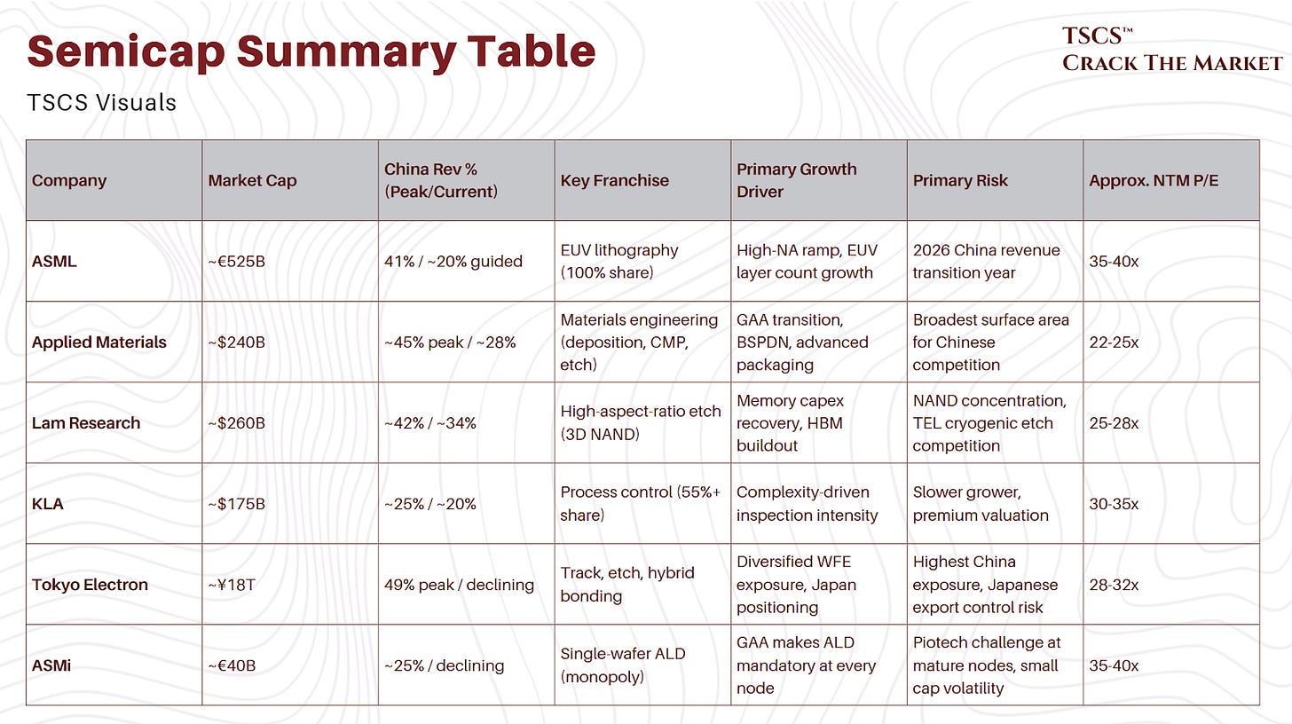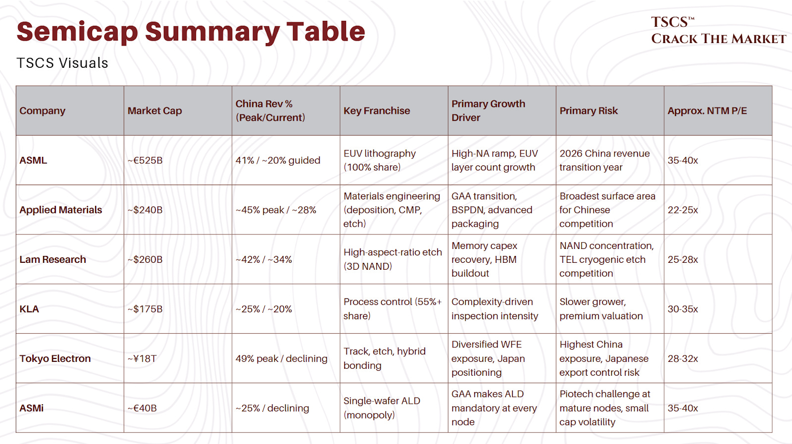 What TSCS has layered on top is an investment framework, editorial opinions throughout, and a comprehensive analysis of the China risk that most semicap primers either ignore entirely or dismiss in a single paragraph.
