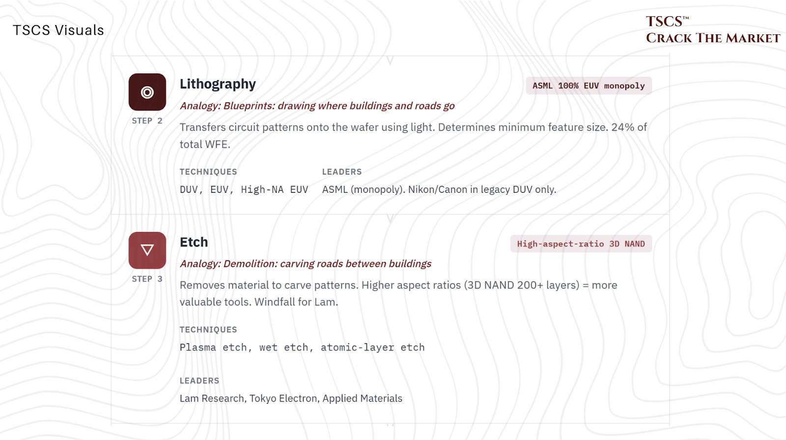 Etch removes material to carve the patterns lithography defined. Lam Research, Tokyo Electron, and Applied Materials. The harder the etch (deeper, narrower, higher aspect ratio), the more valuable the tool. This is why 3D NAND, where channels must be etched through 200+ stacked layers, has been such a windfall for Lam.